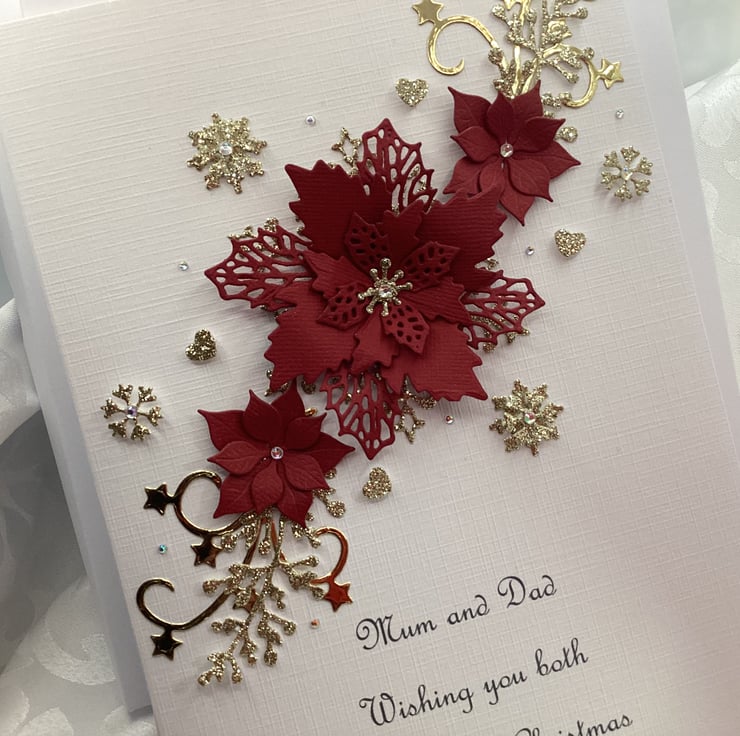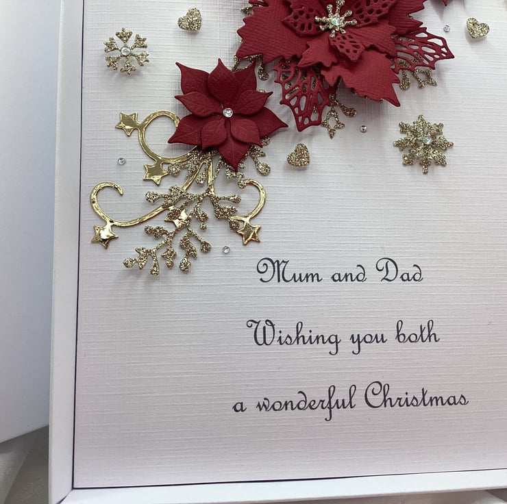 This handmade personalised Christmas card is A5 in size ( 210mm x 150mm) and is on 300gsm heavyweight linen card. The card can be for an individual, a couple or a family and the text can be personalised for you.