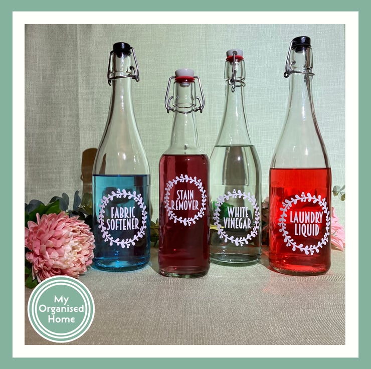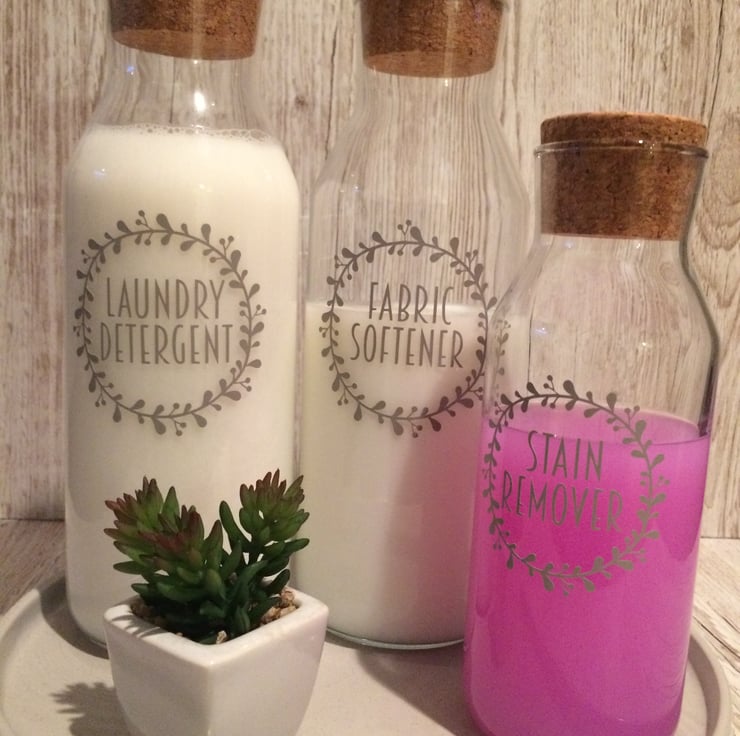 Two sizes available - 8cm and 6.5cm. Please choose the correct size for your container from the drop-down menu. In the main photograph the laundry detergent and fabric softener labels are 8cm diameter, and the stain remover is 6.5cm diameter. Both sizes include the surrounding wreath.