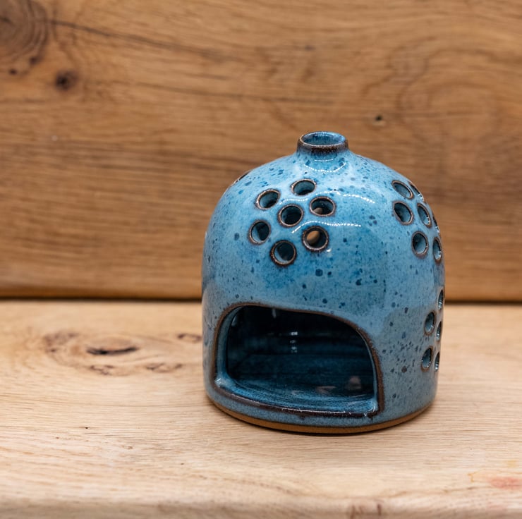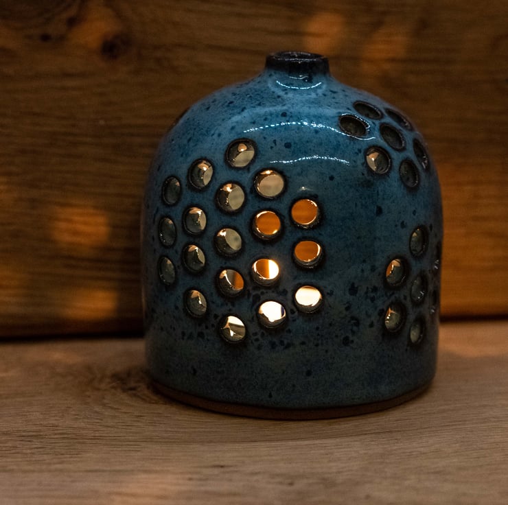 Thrown on the potters wheel in strong red stoneware and pierced with a hand tool to produce a sparkly warm glow from a tea light candle.
