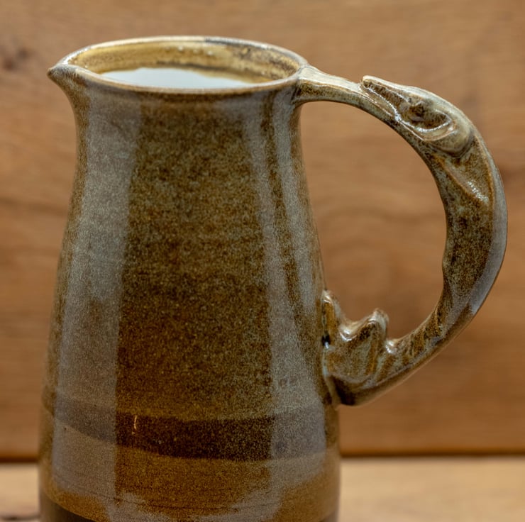 Thrown on the potters wheel in strong white stoneware and finished with a hand carved sighthound handle.