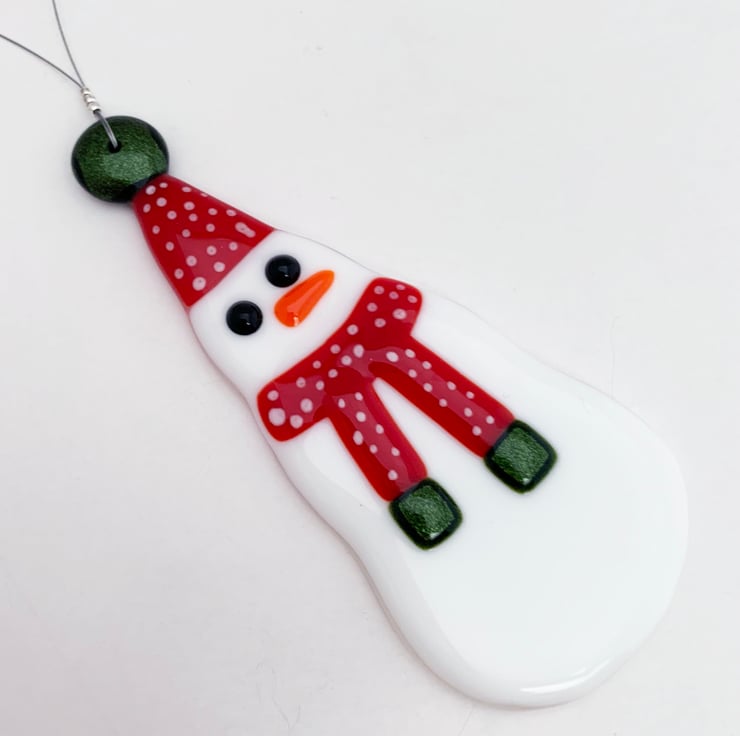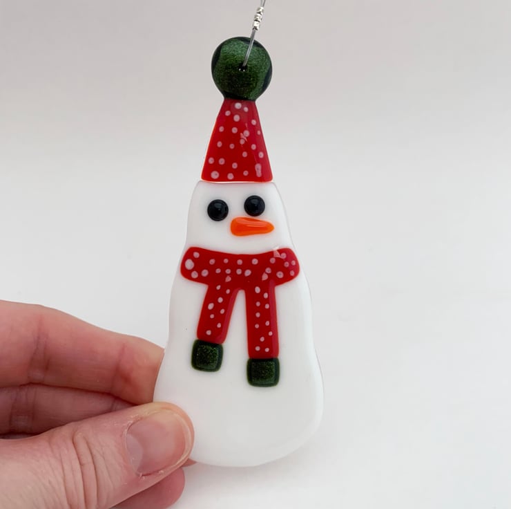 Fused glass hanging snowman decoration, with a green and red spotty scarf and bobble hat. This looks lovely on a Christmas tree and would make a great postable gift.