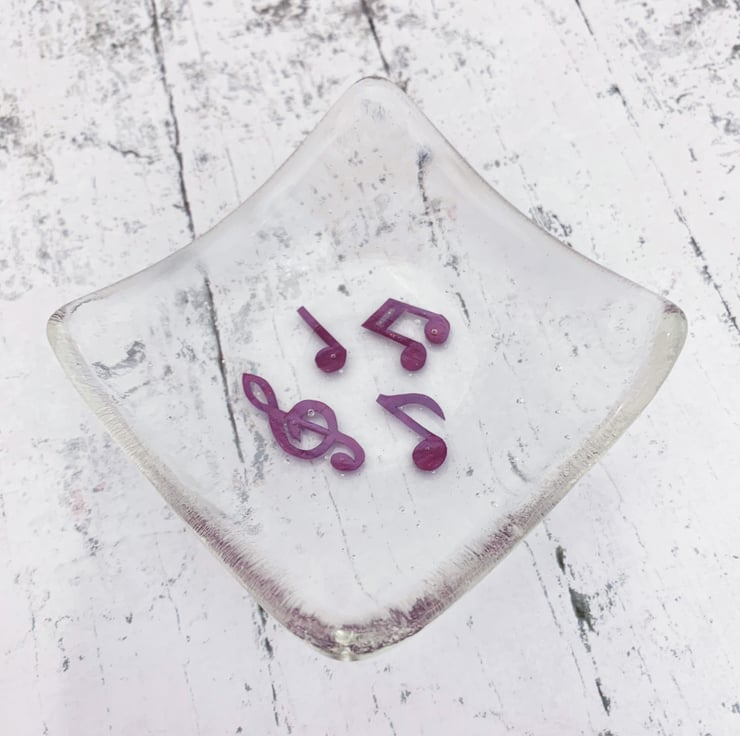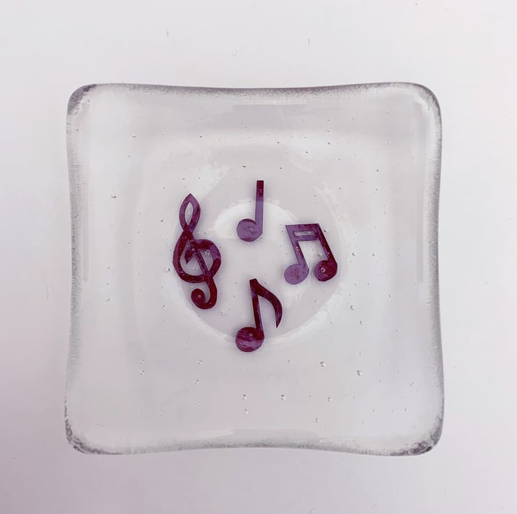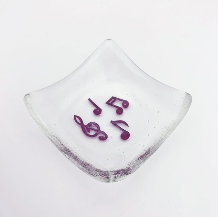 Fused glass dish with a handcut copper foil musical notes in the centre. Perfect for having on your bedside table and putting your earrings in. Would make a lovely gift for a musical person in your life.