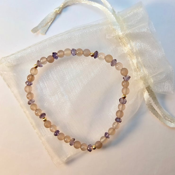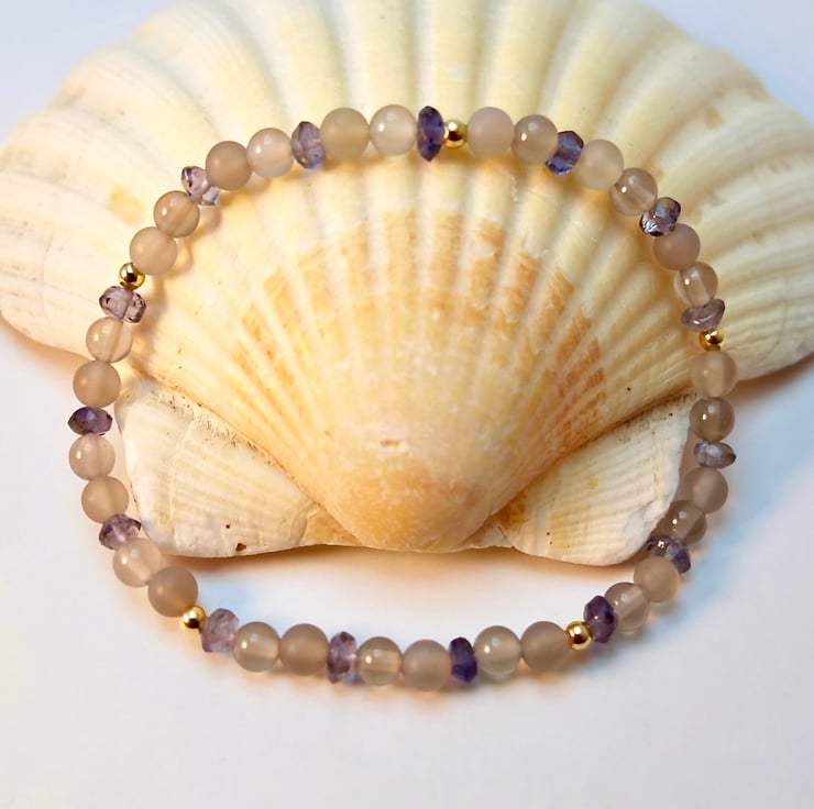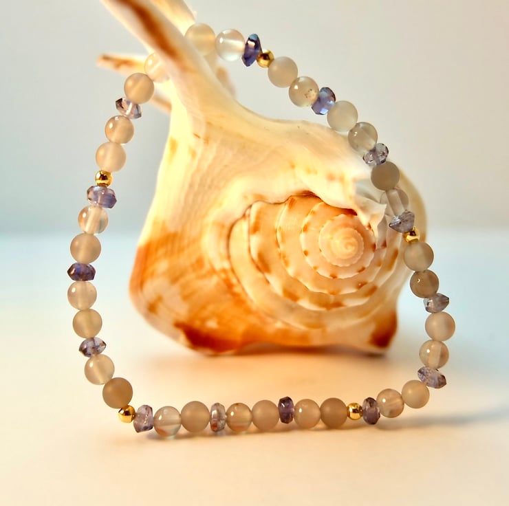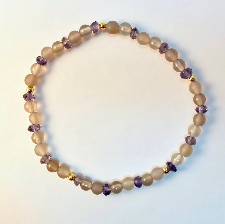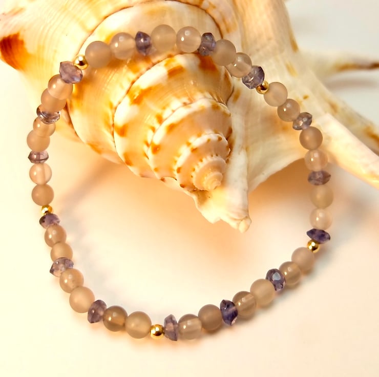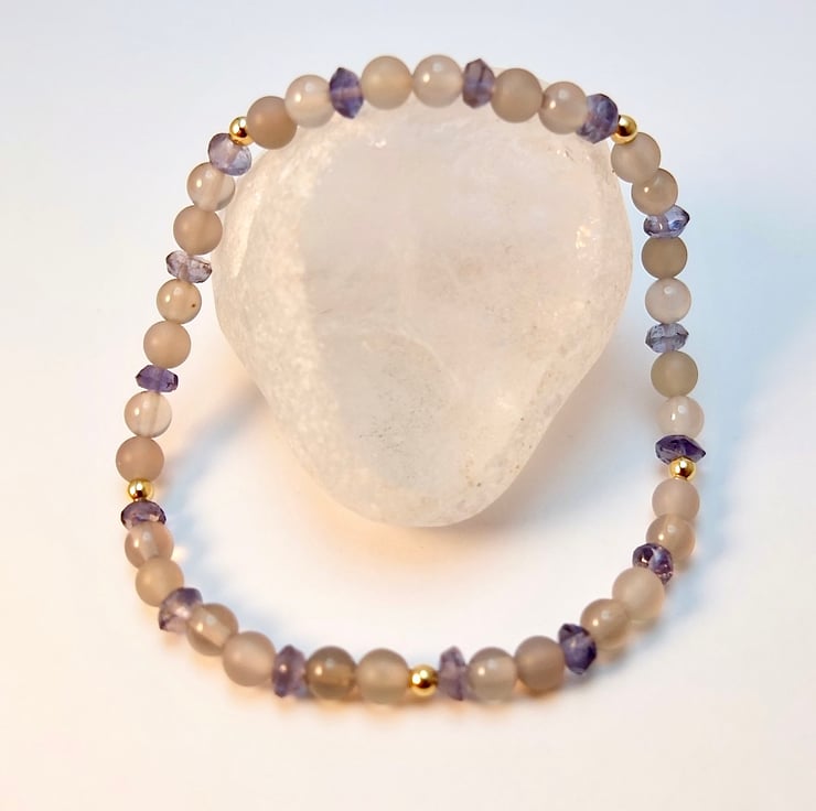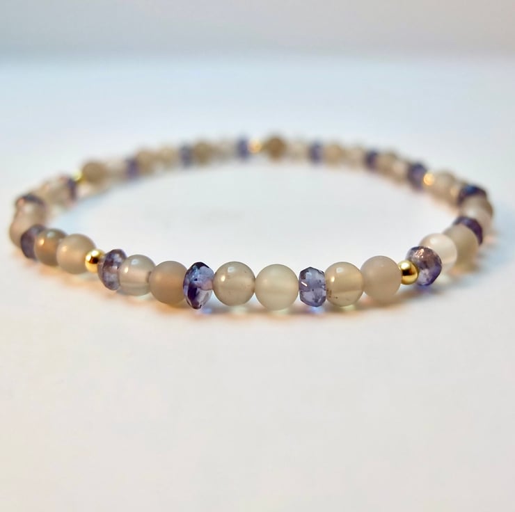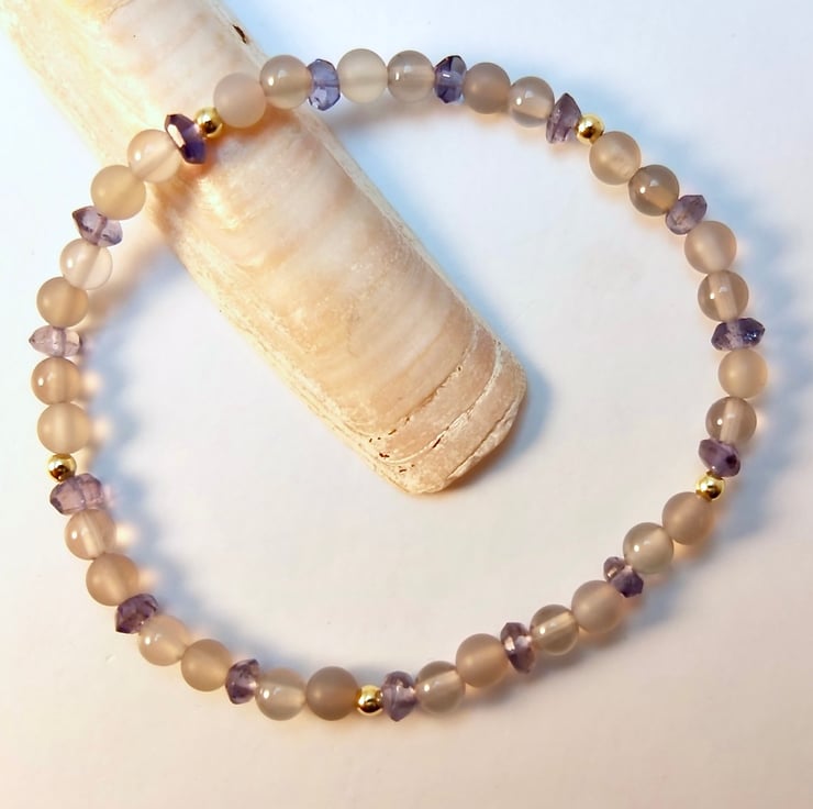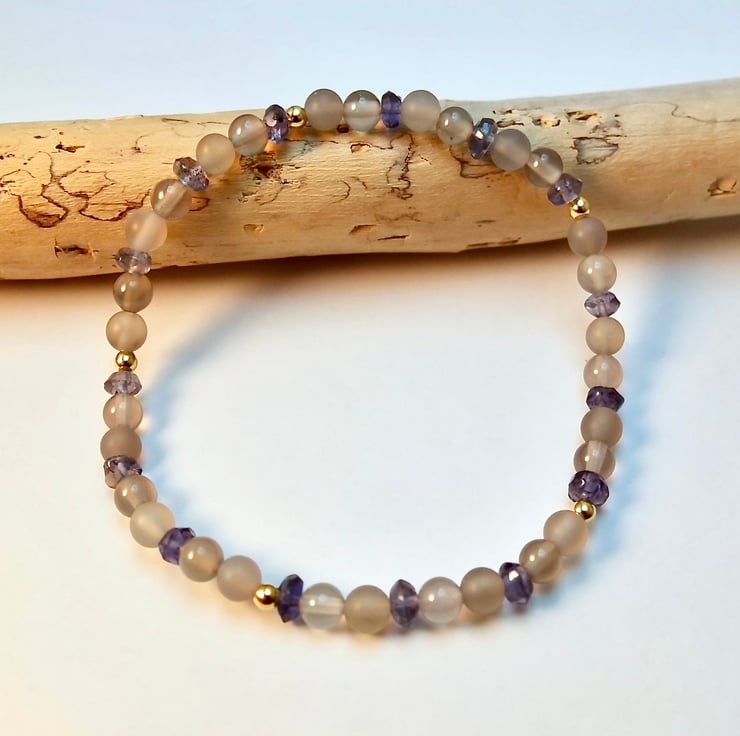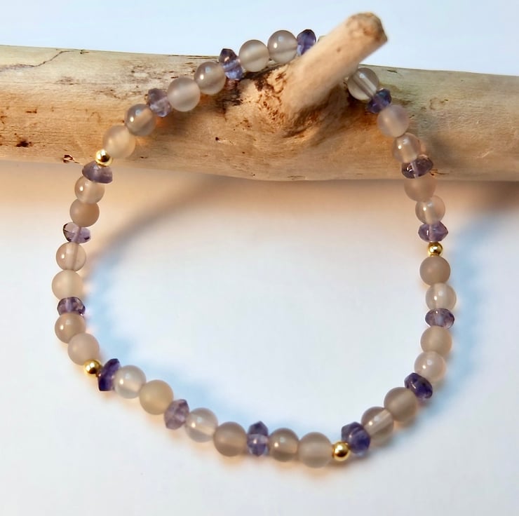 Dainty stretch bracelet made from 4mm polished and frosted light grey Agate beads interspersed with 3.5mm Iolite rondelles and 2.5mm gold vermeil rounds.