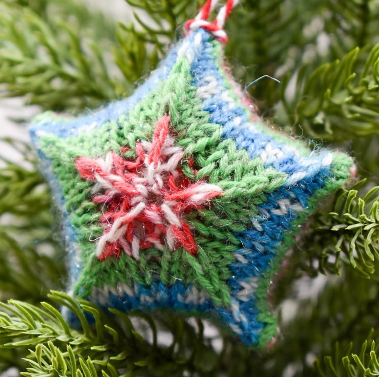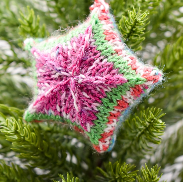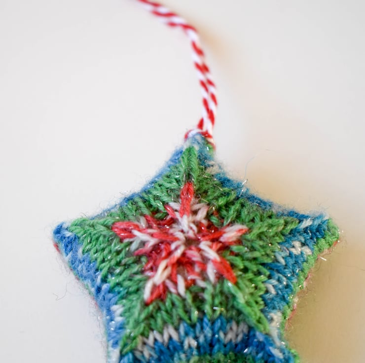 This is a lovely little 5 pointed star, knitted in multicoloured yarn which has a sparkly thread running through it and stuffed with toy grade wool stuffing which conforms to EN71, BS1425, BS5852. The star is finished red and white baker's twine to hang.