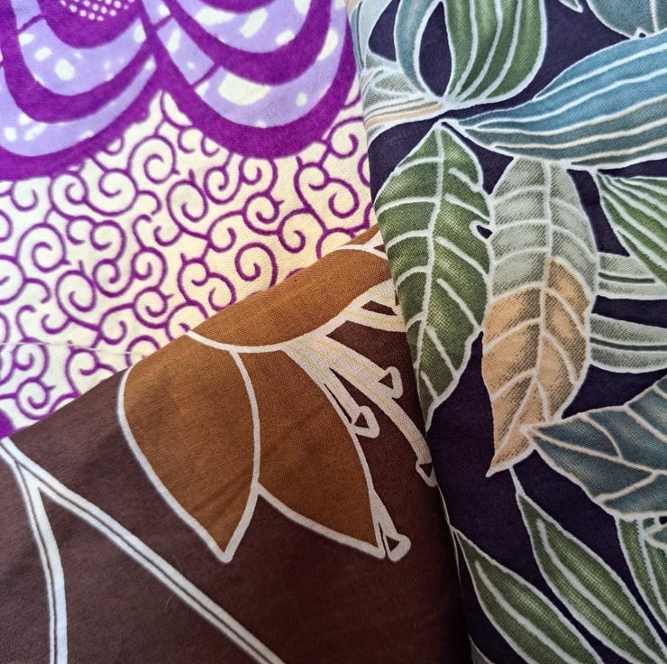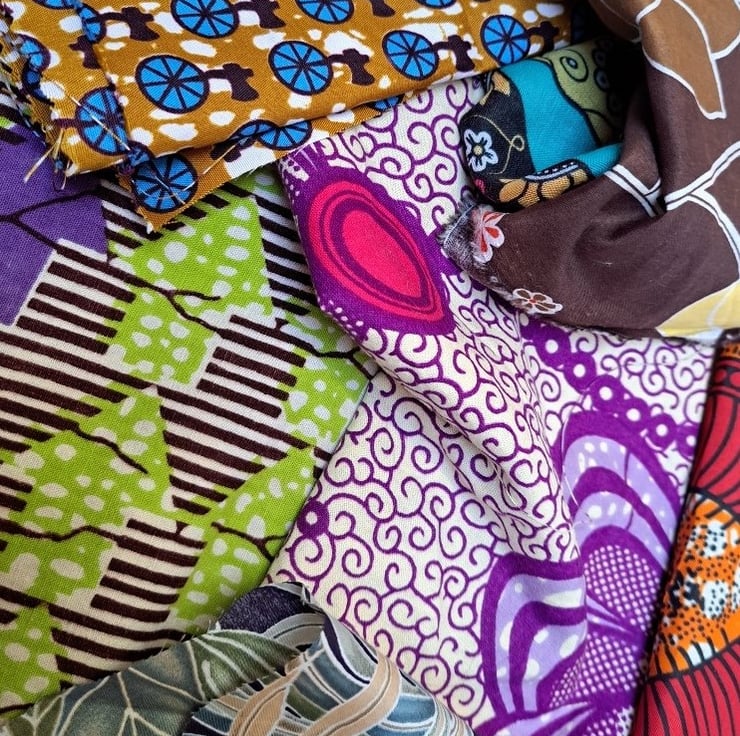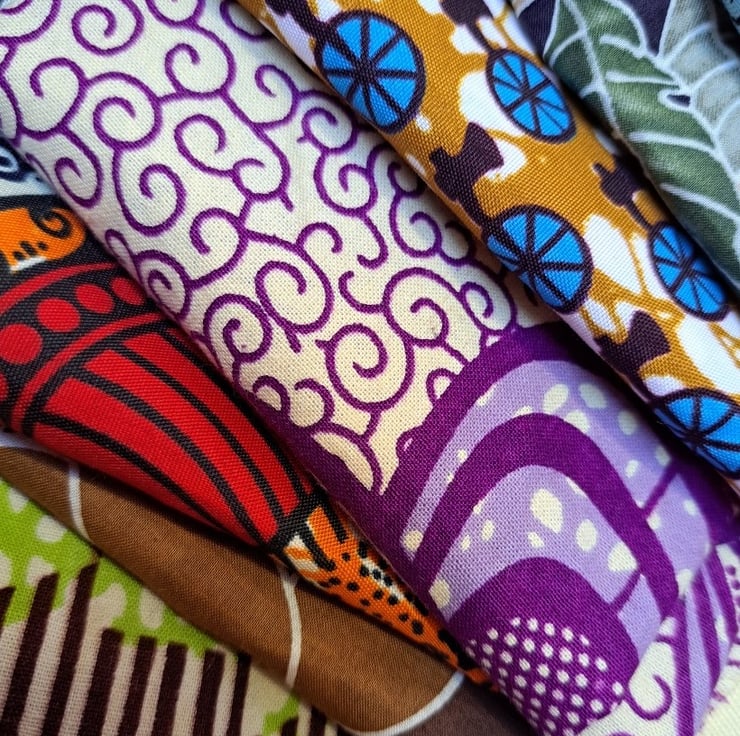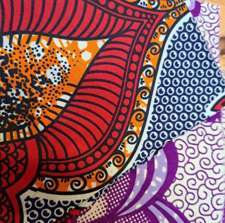 A seven-piece fabric collection on the theme of bright and beautiful. Sizes vary - biggest is 127cm by 48cm and the smallest is 27cm by 30cm. Four of the pieces are genuine African wax print.