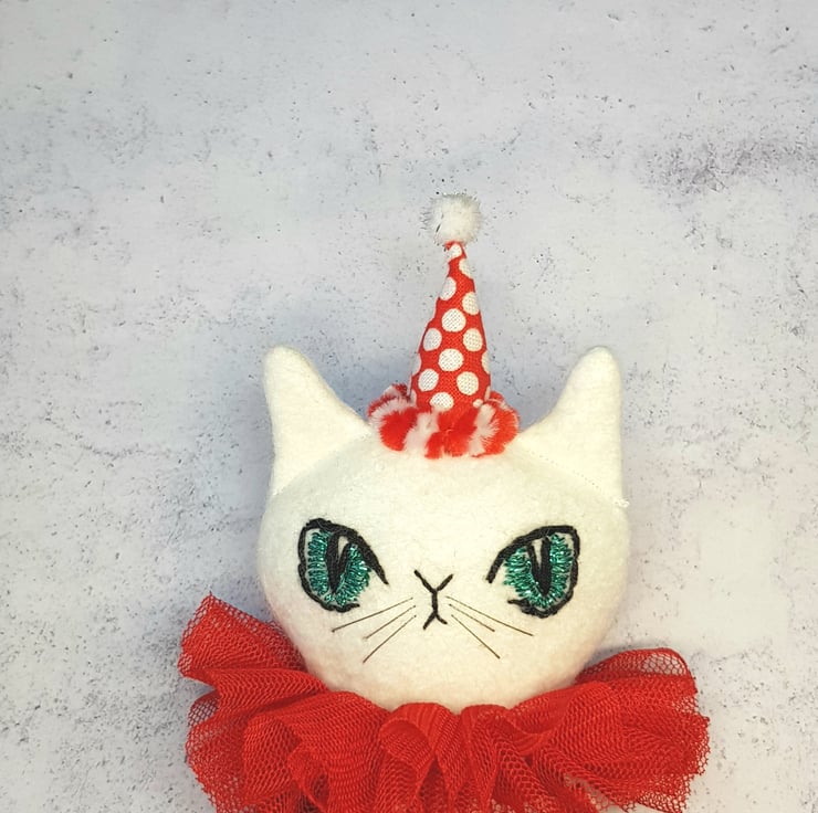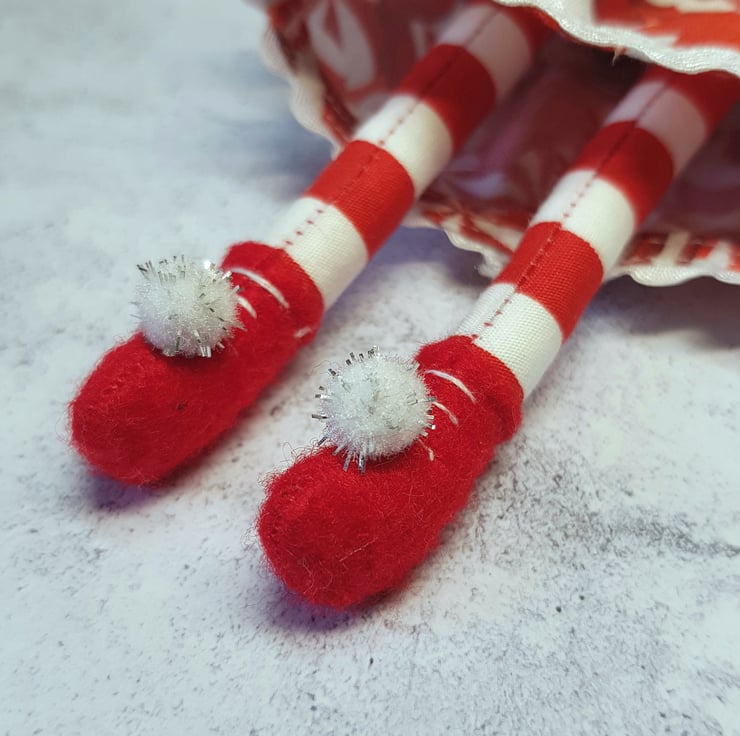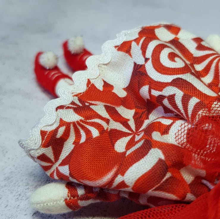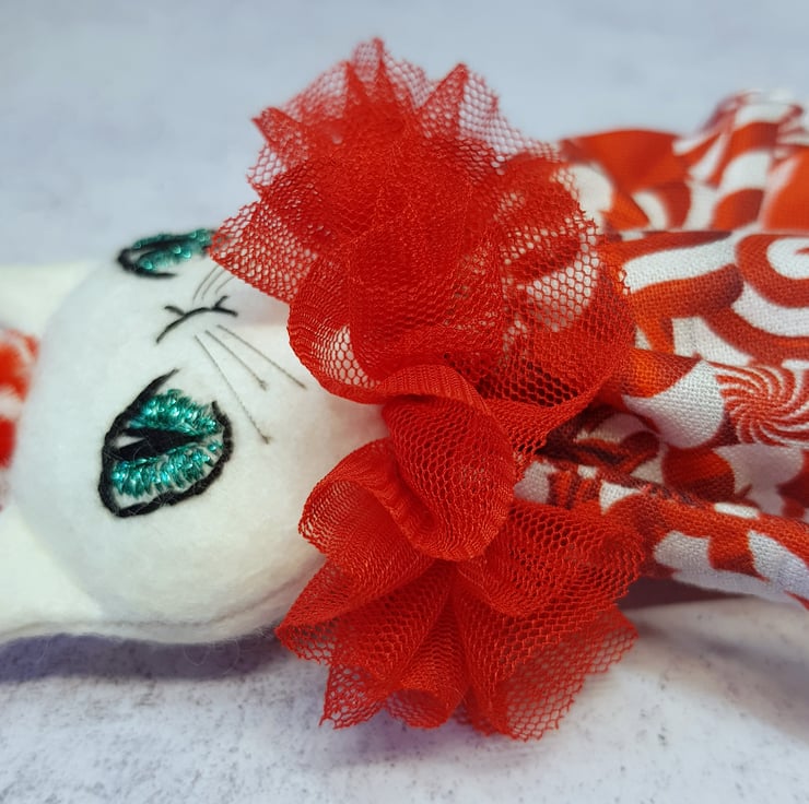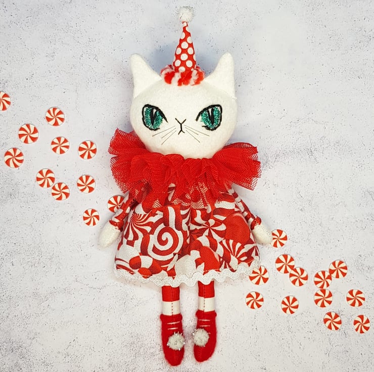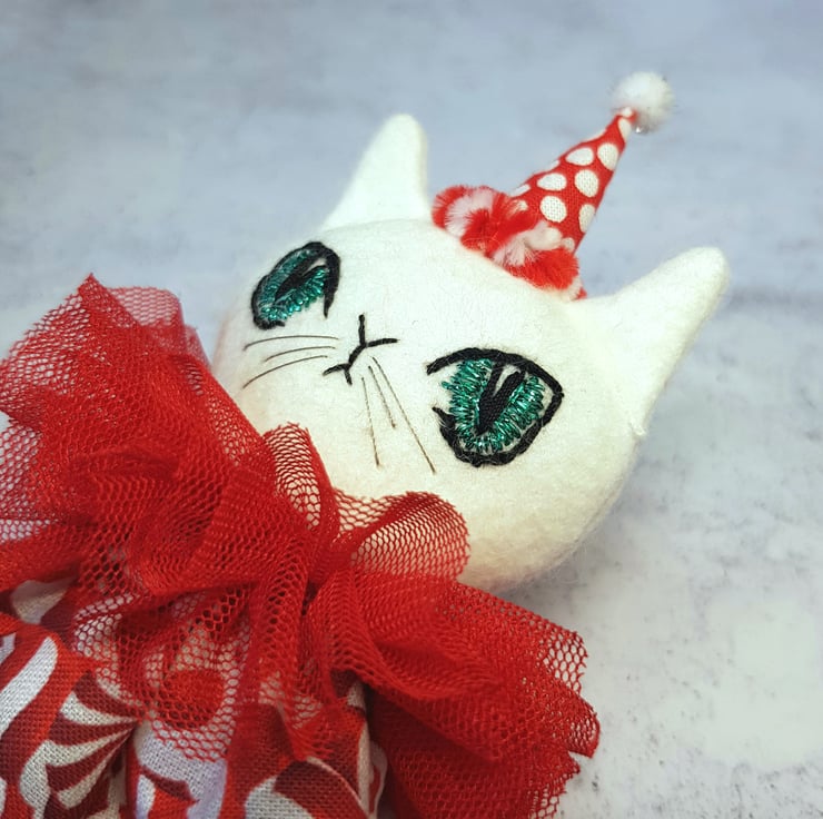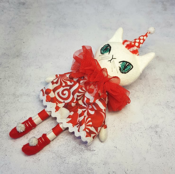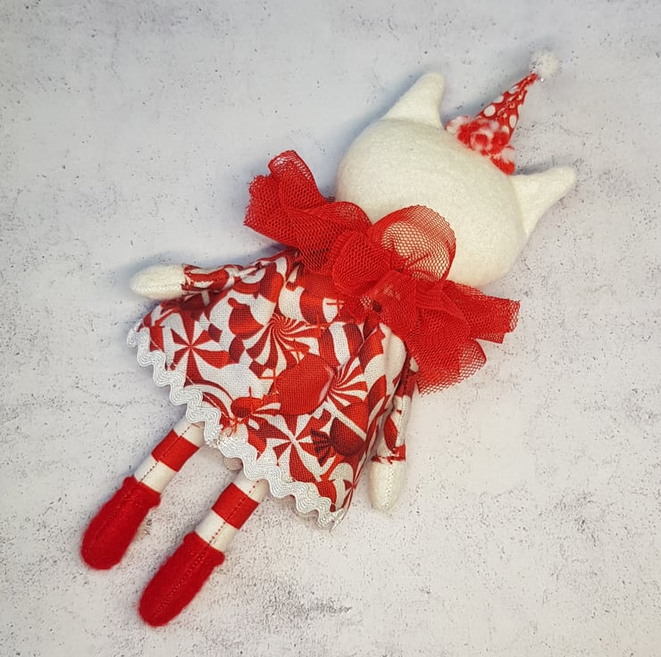 This white cat is all dressed up in their candy cane best. They wear a hand sewn party hat with fluffy trim and topped with a sparkly pom. The face is hand embroidered with metallic thread eyes. The dress is partly hand sewn with red neck ruffle white ricrac trim sewn into place around the bottom. They wear felt boots with hand sewn laces and sparkly poms. This doll measures roughly 20cm tall and comes beautifully and simply wrapped in recyclable packaging. This is not a toy and meant for decorative purposes only.