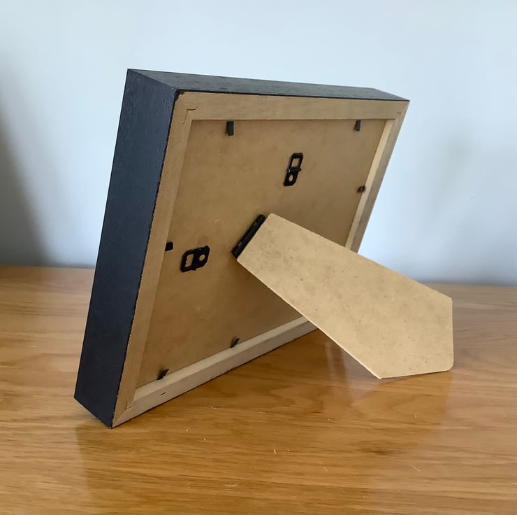 The frame is 28cm x 23cm and is black with a white and black inlay and can be standing or wall hanging.