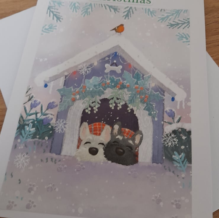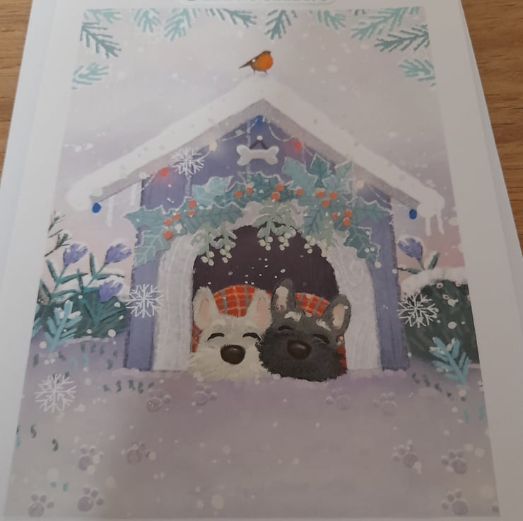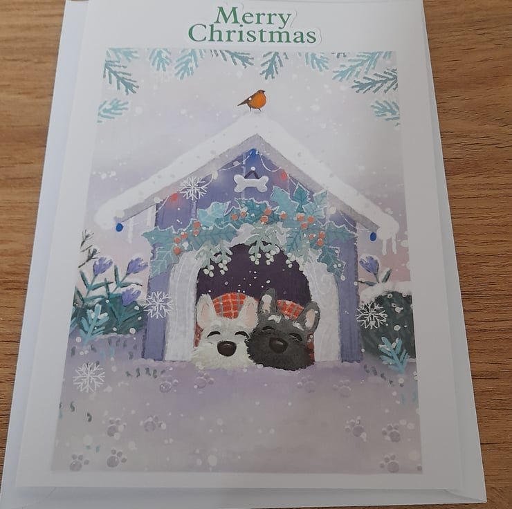 DESIGNED AND HANDMADE BY MYSELF, CUTE CHRISTMAS CARD WITH TWO SCOTTIE DOGS, SLEEPING IN THERE CHRISTMAS DECORATED DOG HOUSE AND MR ROBBIN WATCHING OUT FOR TROUBLE. LOVELY CHRISTMAS SCENE.