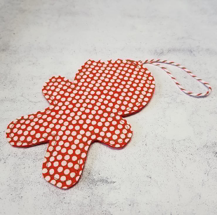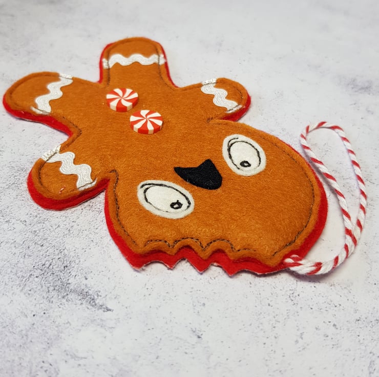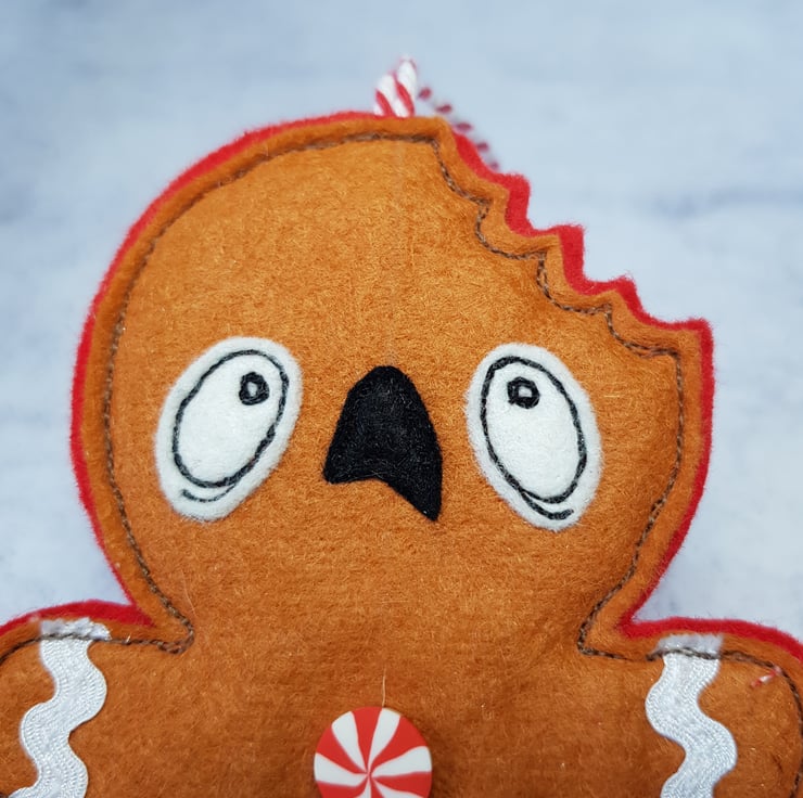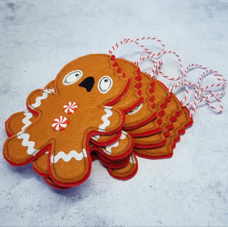 These unfortunate fellows have handmade candy cane swirl buttons and white ricrac trim. Their faces are free motion embroidered and they measure roughly 11.5cm tall and 8.5cm wide. These Christmas decorations are made from 3 layers of felt with the bottom layer cotton backed in complimentary red polka dot. This listing is for ONE gingerbread man. They come with red and white twine hangers attached. This is not a toy and meant for decorative purposes only.