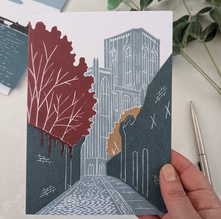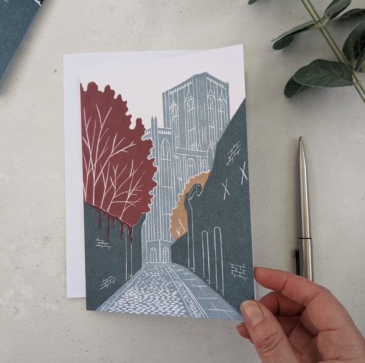 This card is based on my York Minster linocut print, which I produced for York Open Studios 2021. The original print was inspired by a photo I took of one of my favourite views of the Minster from Chapter House Street. I ensure that all my cards are printed on to 100% FSC approved card and are uncoated.