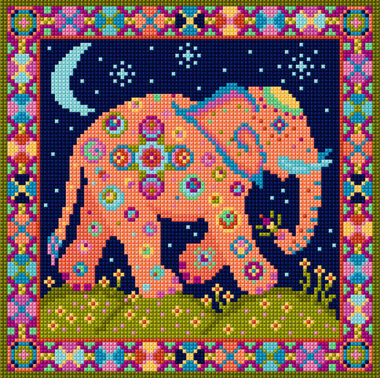 Elephant Moon Tapestry Kit, a fabulous and fun elephant needlework design in gorgeous rich wool colours.