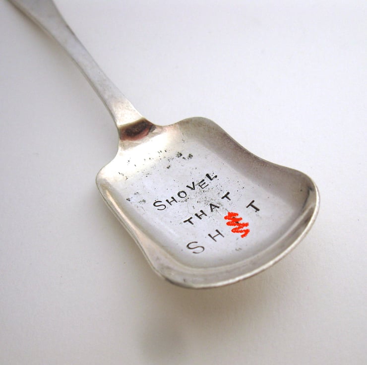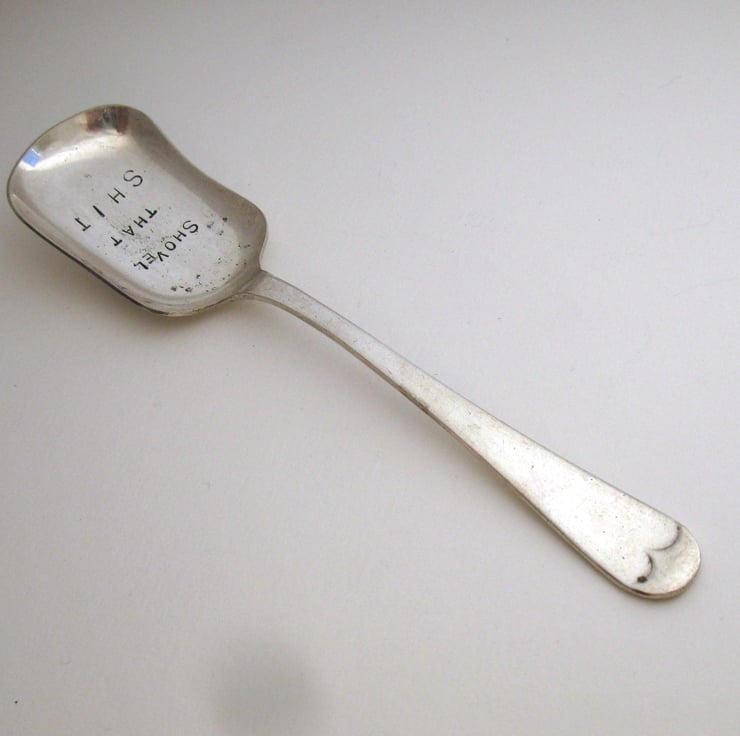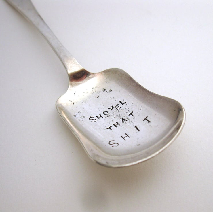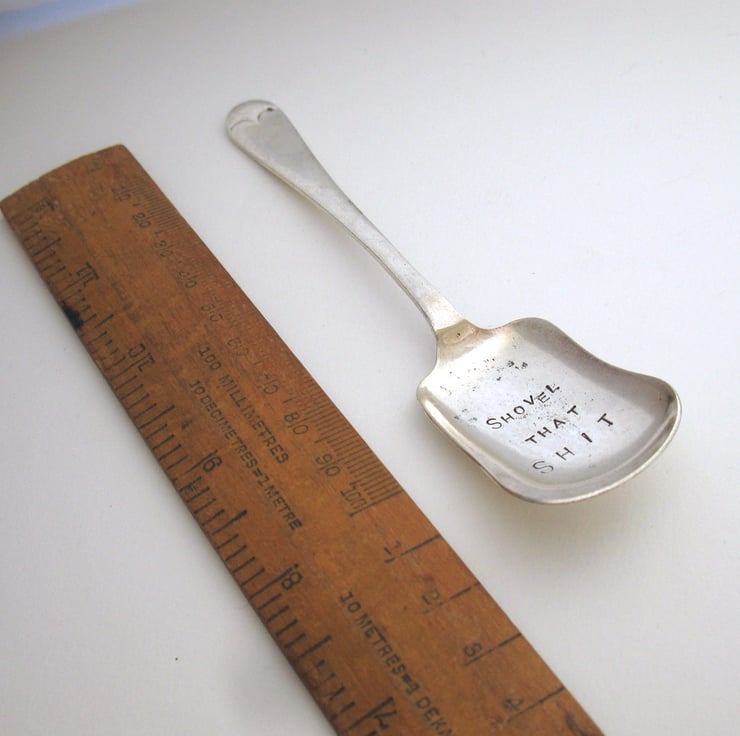 A rude little vintage caddy spoon or sugar scoop hand stamped with the words SHOVEL THAT SH-T in nice clear block capitals. The spoon has a plain 'old english' style handle and a shallow rounded oblong bowl, perfect for shovelling loose tea, drinking chocolate, sugar, herbs or spices or even for use as a scoop when crafting with pigment powders, glitter or tiny beads.