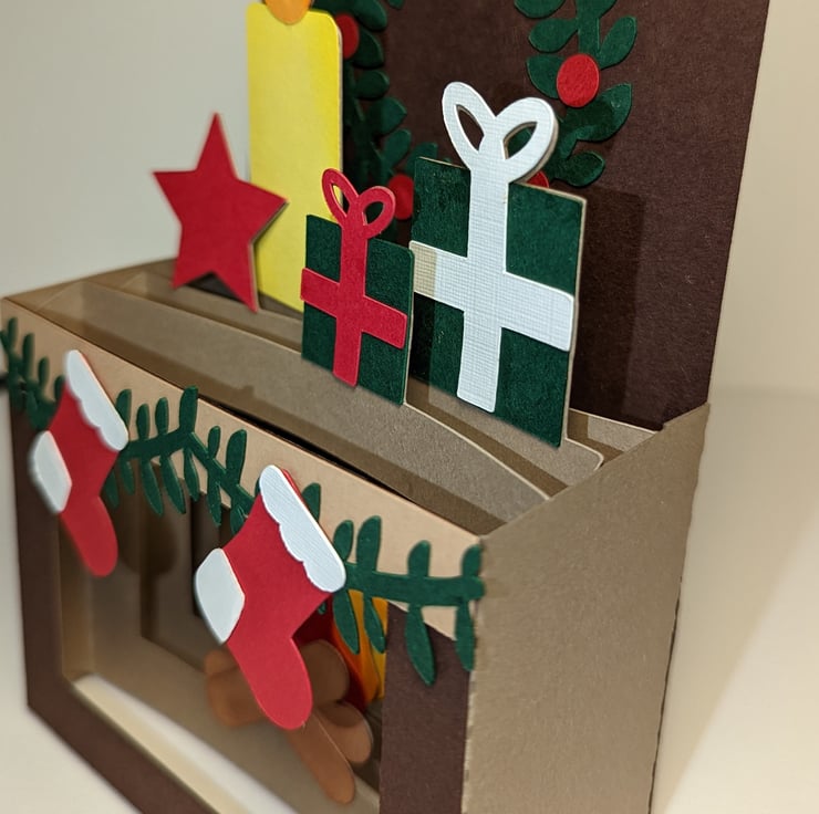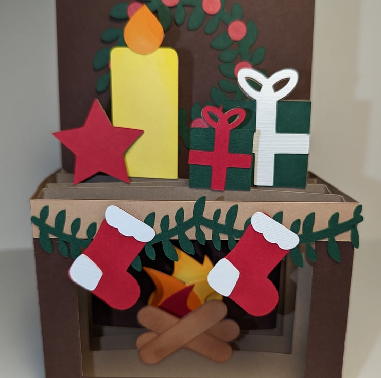 This box card is a fireplace complete with stockings hanging on the mantle. The card folds flat to fit in the envelope provided. There is a white panel on the back of the card for you to write your own message. A personalised sentiment can be added to the front of the card, just let me know when ordering what you would like.