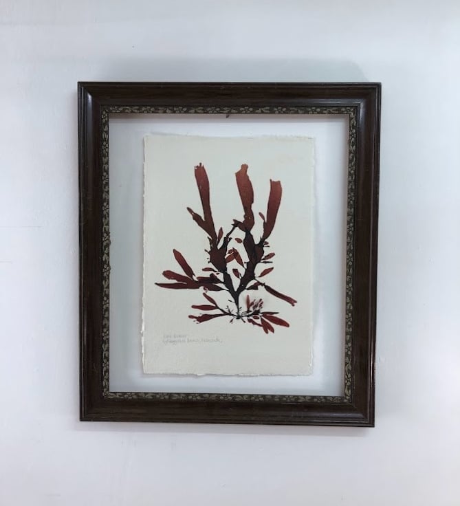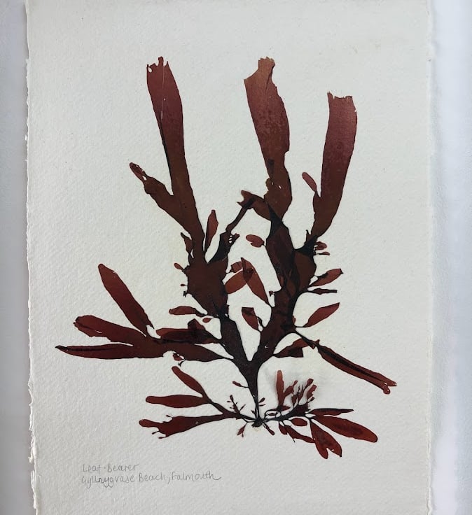 This leaf bearer seaweed was found, complete with it's holdfast, washed up after December storms, on Gyllnygvase beach in Falmouth, Cornwall. It has been pressed onto a beautiful piece of handmade paper by Khadi papers, ready for you to mount or frame as you choose.