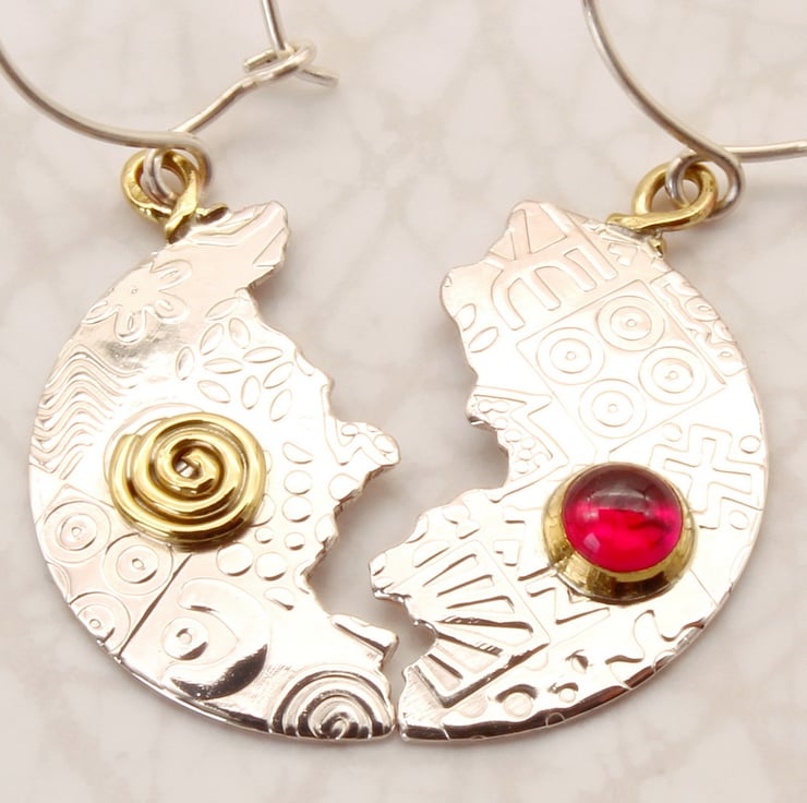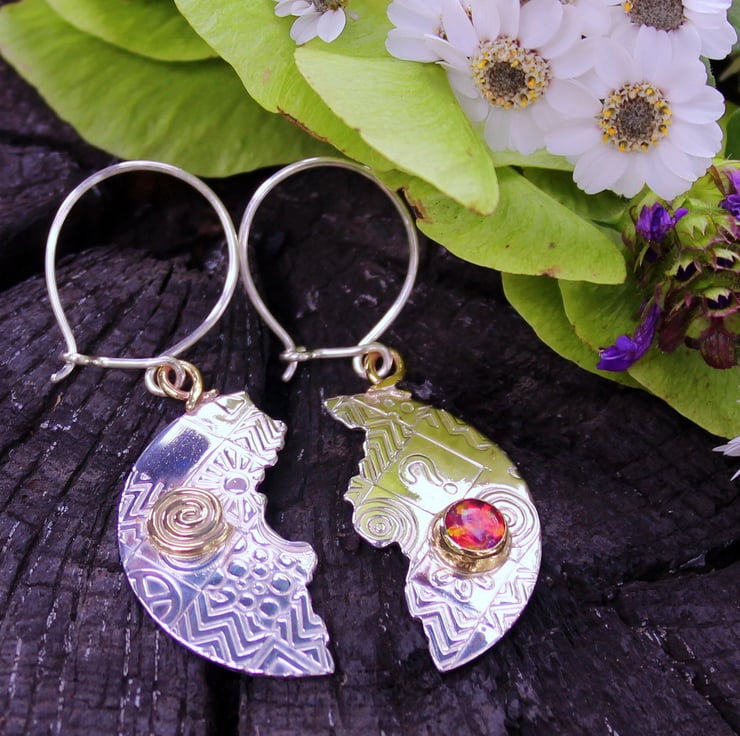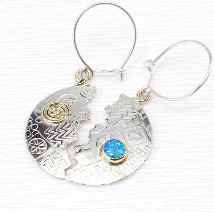 These round asymmetrical earrings have been designed and handmade by us in our workshop in Yorkshire. They are made from sterling silver, are slightly domed in shape and measure 30mm in diameter when together. One of our wonderful 6mm lab. grown blue Opal triplet gemstones features on one of the earrings and a decorative brass swirl on the other.