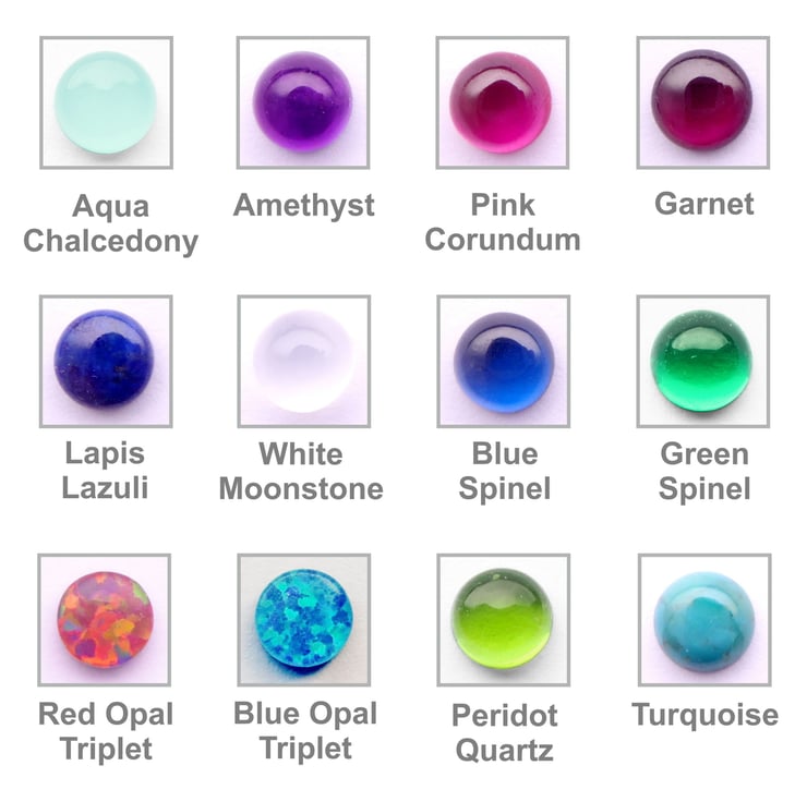 We offer a selection of gemstones: Amber, Amethyst, Aqua Chalcedony, White moonstone, Garnet Lapis lazuli, Turquoise and lab. grown gemstones: Red and Blue opal triplets, Pink corundum, Blue and Green spinels and Peridot quartz. Please make your choice from the drop-down box.
