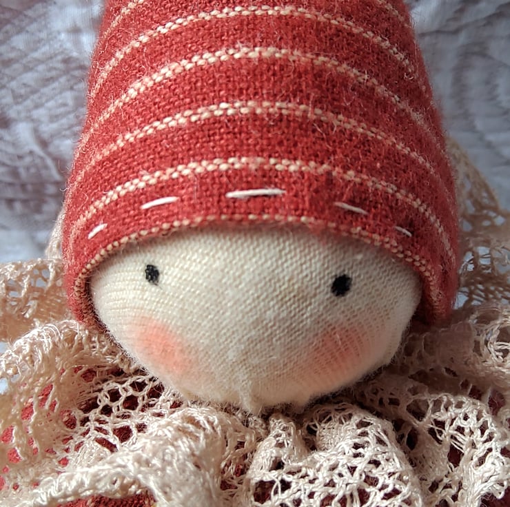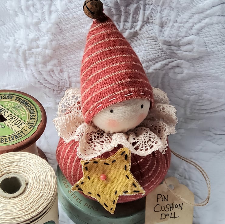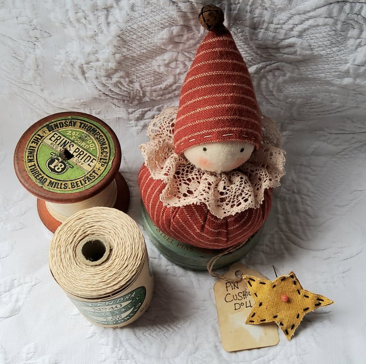 This pin cushion doll is made from rusty red and cream striped homespun fabric. .Her head is made from natural coloured cotton jersey, stretched over a spun cotton ball. The eyes have been painted and she has little flushed cheeks. The hat is finished with a little rusty bell and her pretty neck ruff has been made from vintage lace. She also has a star and a heart to pin to her body or hat and will also come with a couple of pins ( I forgot to take a pic with the heart ) !! X