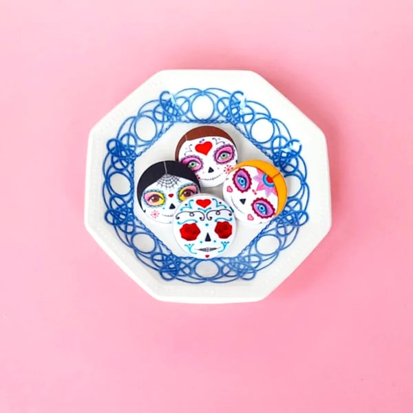 These doll face covered buttons feature some of my Day of the Dead designs. The doll face images have been digitally printed on to 100% cotton fabric and hand stitched on to button blanks to give a quality finish. The buttons come nicely packaged and would make an extra special gift for crafters and knitters..