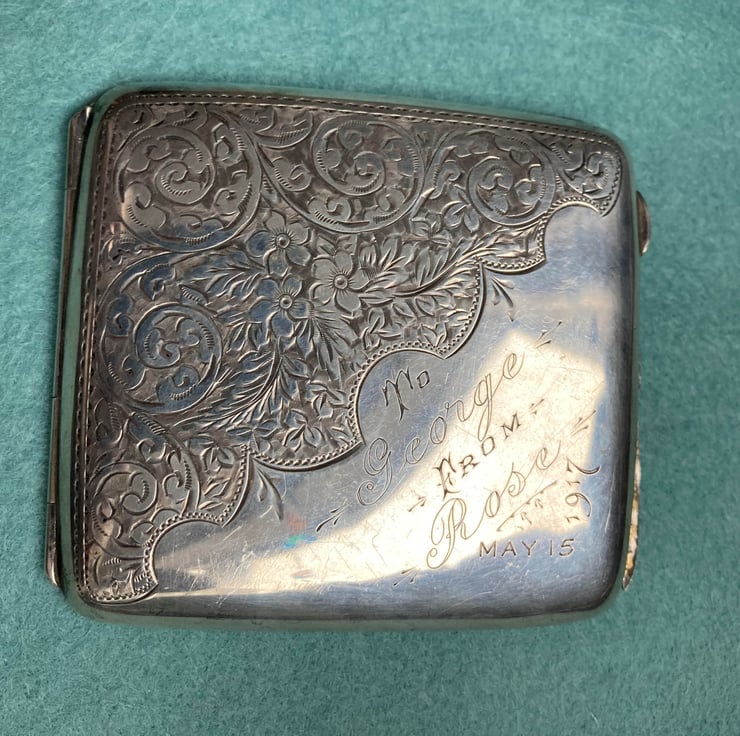 The inscription on this cigarette case was To George From Rose May 15 1917. It has such a beautiful pattern and history. I enjoy making jewellery from bent or damaged silver retro items as they have had a life and usually have some great engine turned patterns. It also saves silver from being taken out of the ground at huge risk to the workers and the environment.