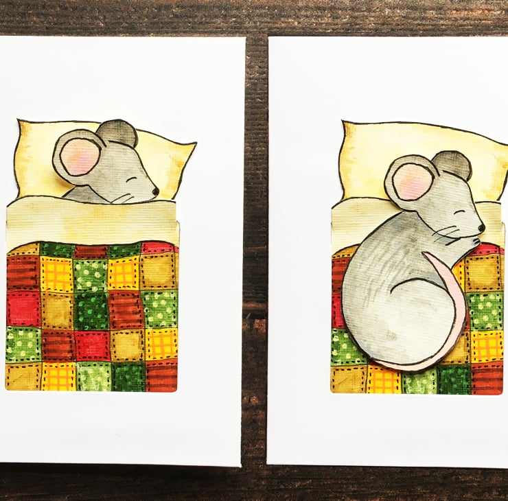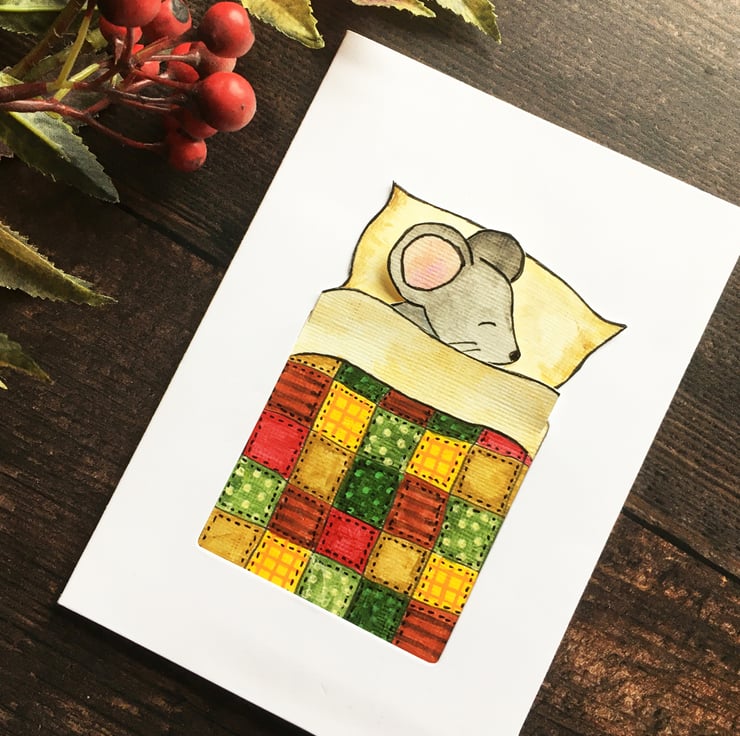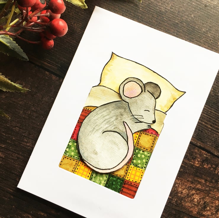 I've painted the sleepy little mouse with acrylic paints on 300gsm paper and made a stiff paper pocket so that he can slide under a patchwork quilt and rest his head on the pillow.