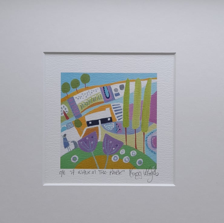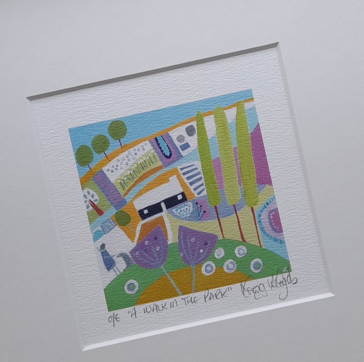 Part of an older print run of illustrations. "A Walk In The Park" 23 x 23 cm overall size. Image size 9cm x 9cm approx.