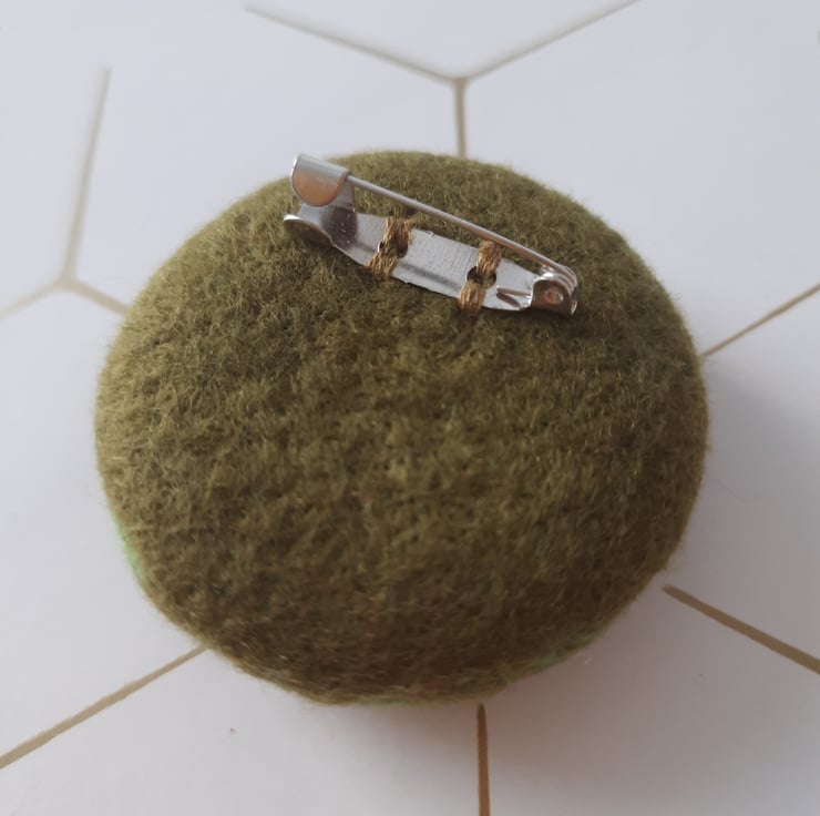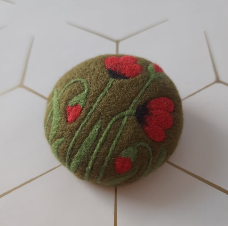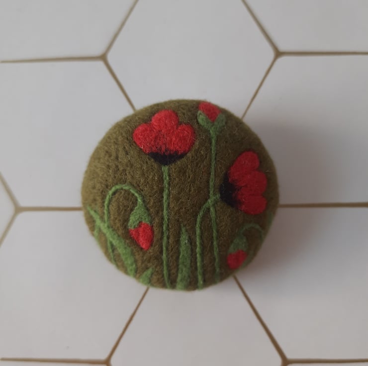100% Merino Wool, with a hand sewn brooch back, it's on a beautiful moss background, with 'poppy' coloured red roving for the flowers.