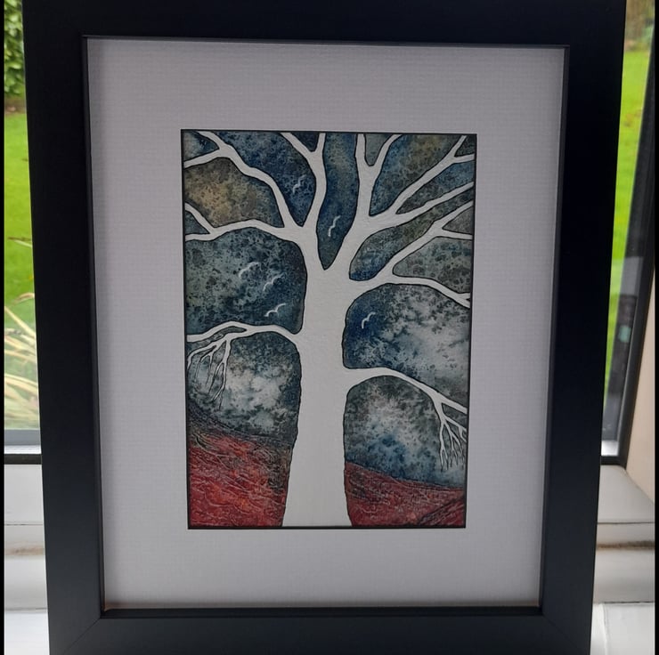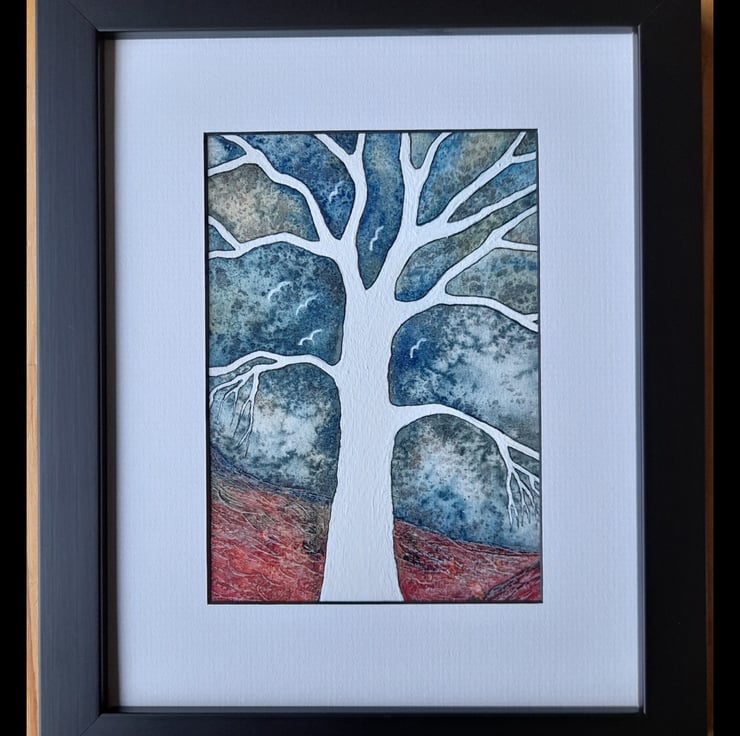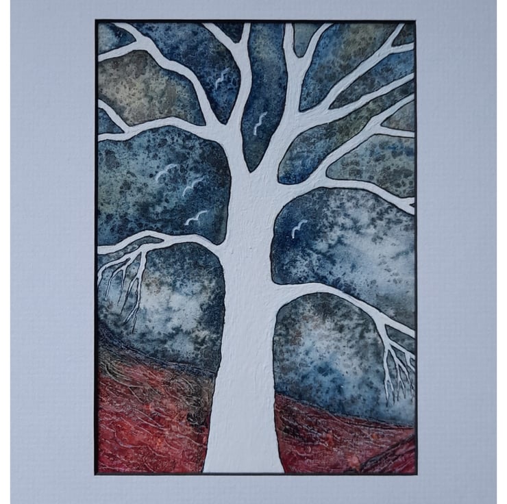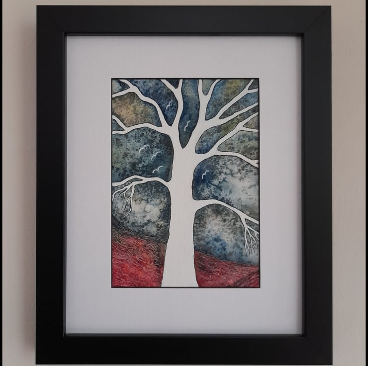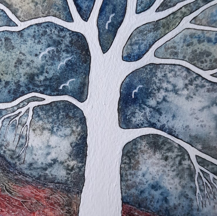 Light in the Storminess, an atmospheric moodscape original painting which seeks to put some positive energy out there. The stormy, moody sky was created with watercolours as was the foreground. The symbolic white tree of light is painted with gouache.