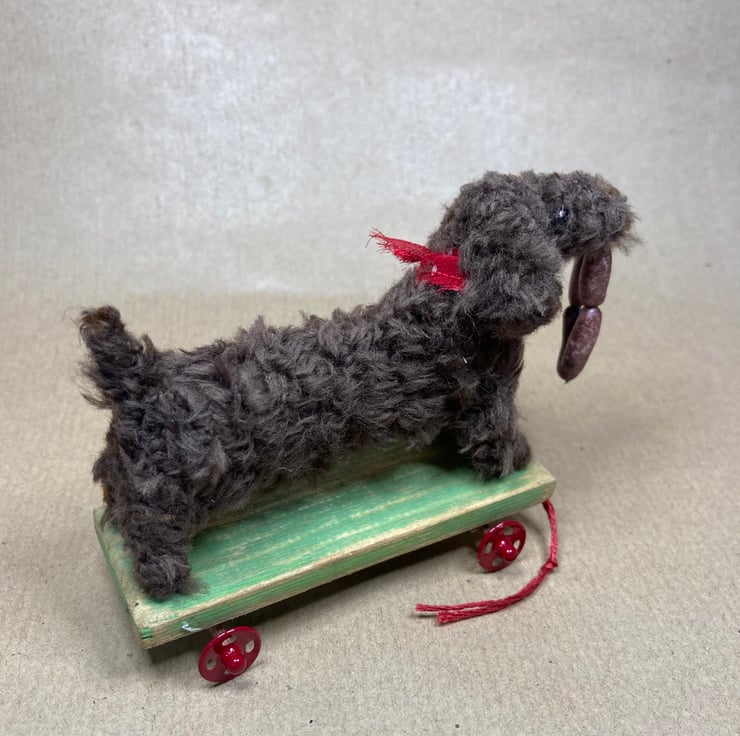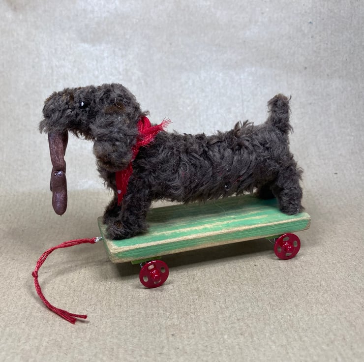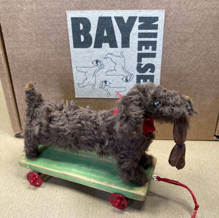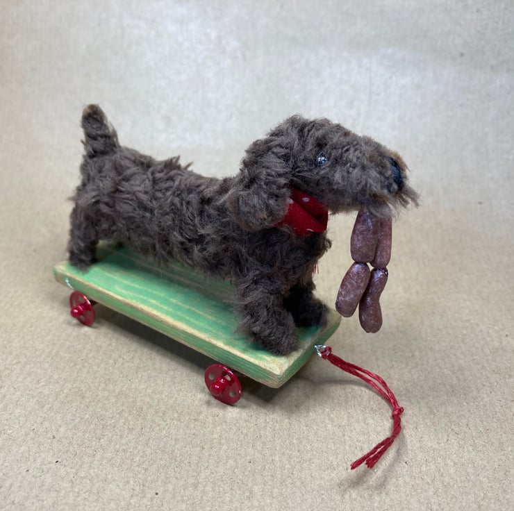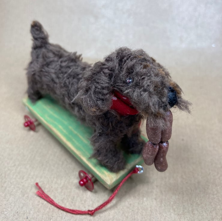 OOAK sculptured miniature dog on a pull along wooden trolley with wheels. All my animals are hand finished with eyes and noses and,if needed, wool whiskers! The wheels on his trolley turn. My animals are not toys but are designed as small pieces of art for display on a shelf - somewhere where they will be admired and loved.