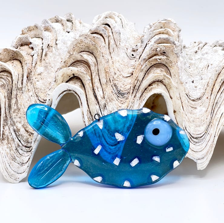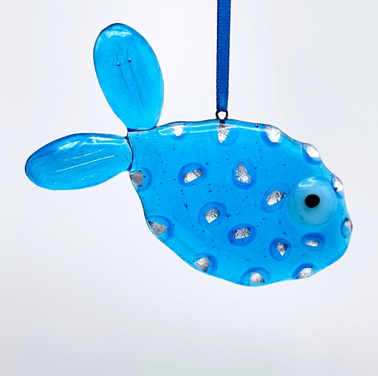 Created from Bullseye sheet glass in my Whitstable garden studio. The body, eye and fins are all hand cut and fused separately before being joined in another firing with the hanging wire secured in place. Final adjustments are made to the shape and then the whole piece is fired again. This pale blue fish has striking fine silver foil glass spots. The iridescent turquoise blue tail has a delicate ribbed effect. A blue satin ribbon is attached to complete the design.