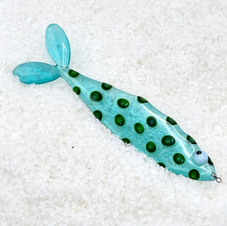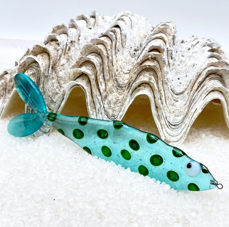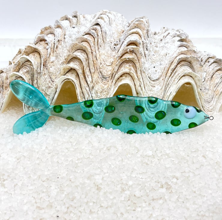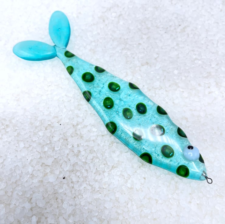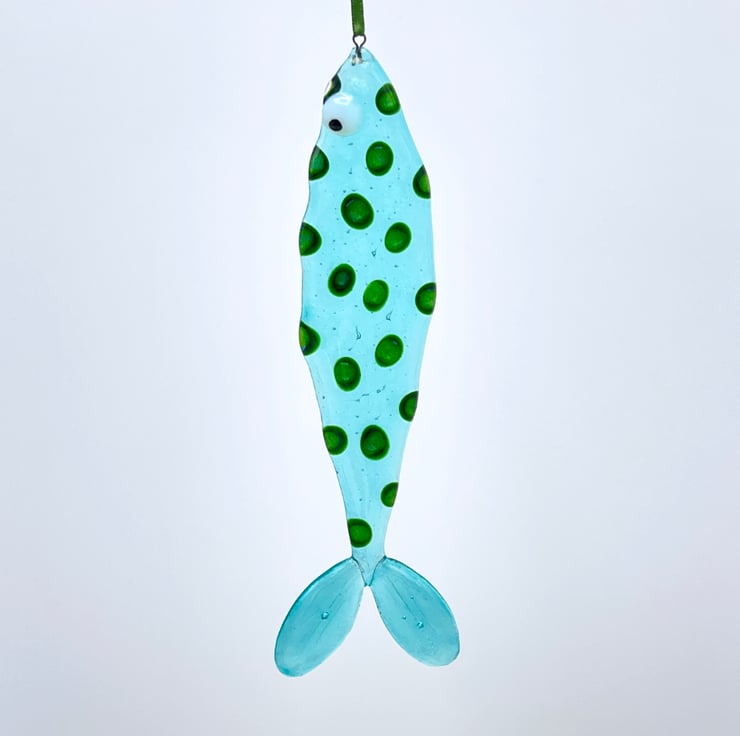 Created from Bullseye sheet glass in my Whitstable workshop. The body, eye and fins are all hand cut and fused separately before being joined in another firing with the hanging wire secured in place. Final adjustments are made to the shape and then the whole piece is fired again. This pale blue and green fish has striking dichroic glass spots. The iridescent tail has a delicate ribbed effect. A green satin ribbon is attached to complete the design.