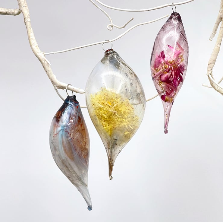 Beautiful lamp worked blown glass bauble holding helichrysum petals from my garden.