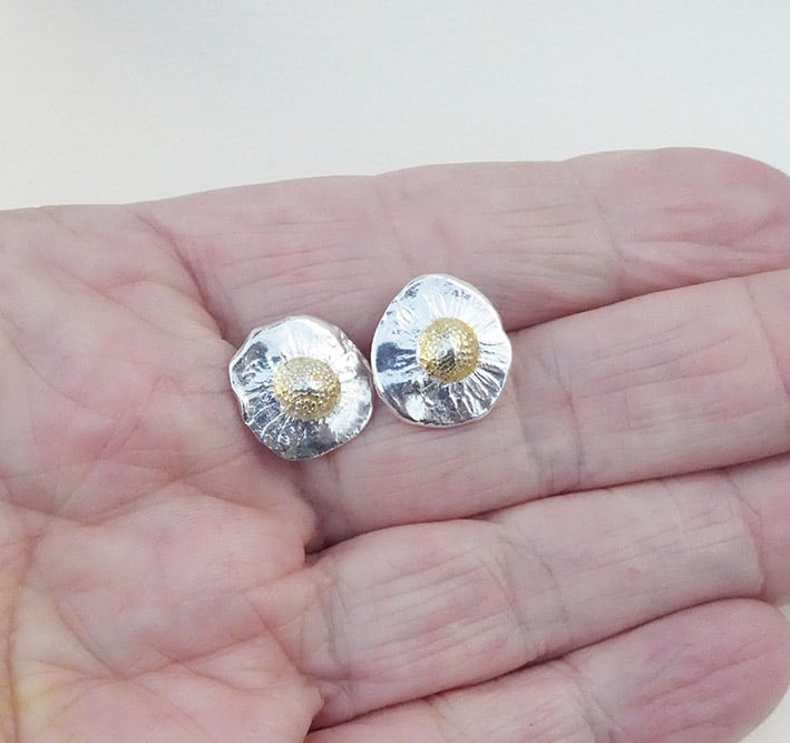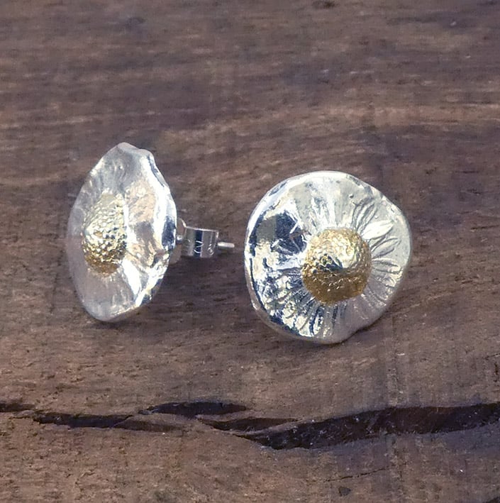 These are my favourite garden-inspired items and are the smallest size of daisy jewellery I make, from moulds I have taken of daisies on my own lawn. I also make drop earrings (slightly larger) and pendants (largest daisies) from time to time, which can be ordered to match. The daisy lends itself ideally to gold centres, though I do also make them in plain silver.