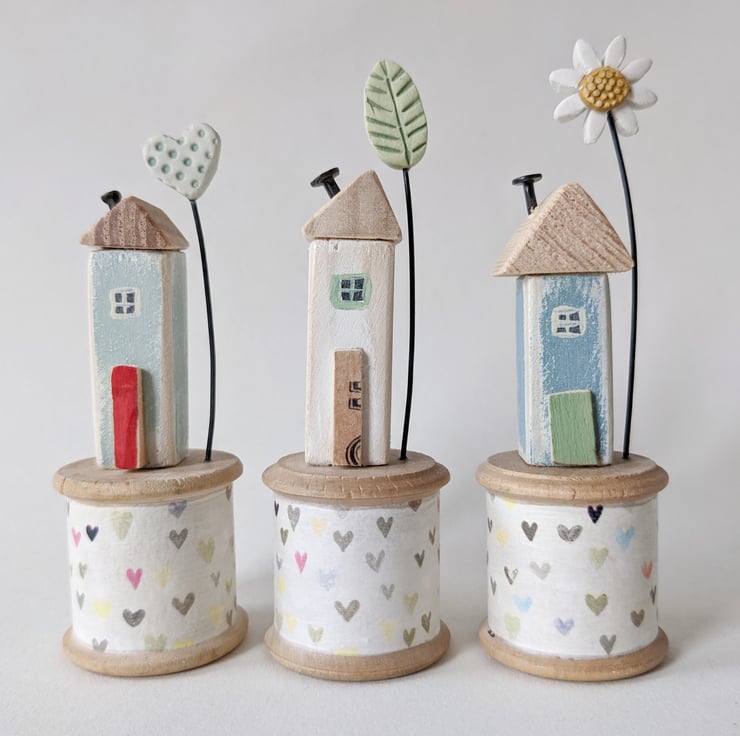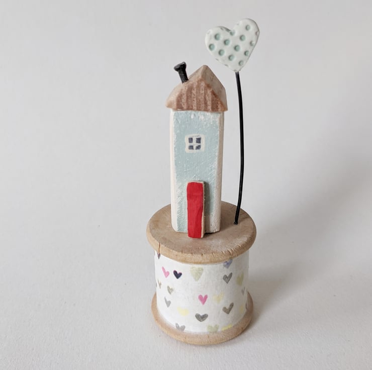 A hand painted little wooden house sits on a vintage bobbin. A patterned and painted clay heart stands beside it.