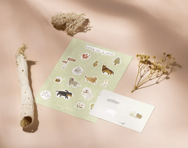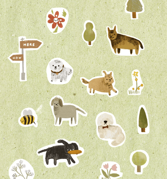 16 peelable stickers of dogs, bees, flowers, and trees on an A6 sized sticker sheet.