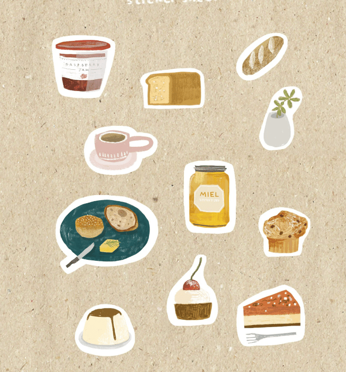 11 peelable stickers of baked goods, coffee, and cafe homeware on an A6 sized sticker sheet.