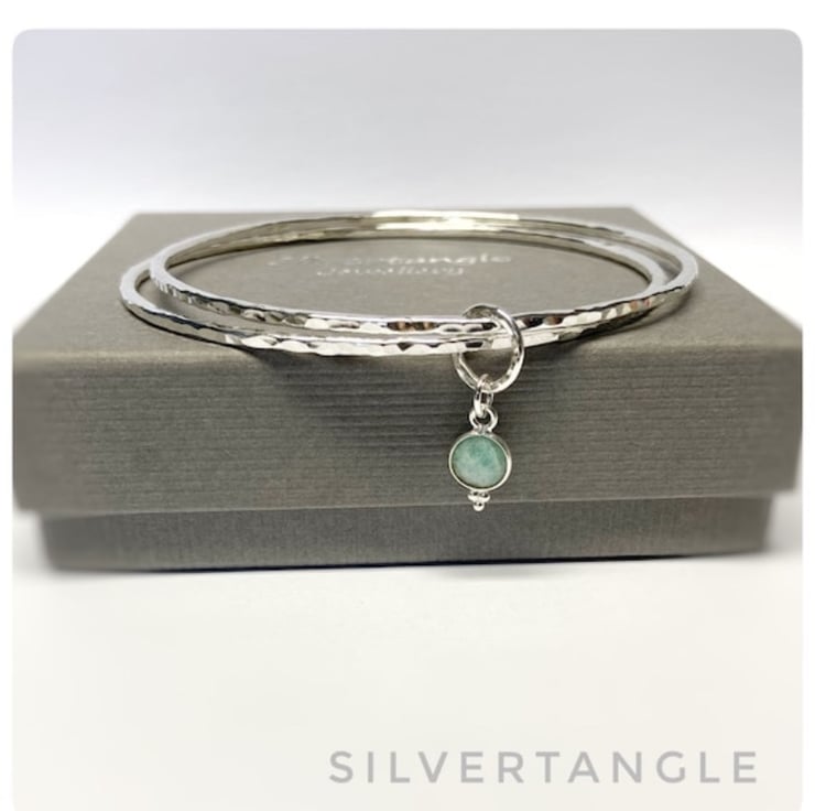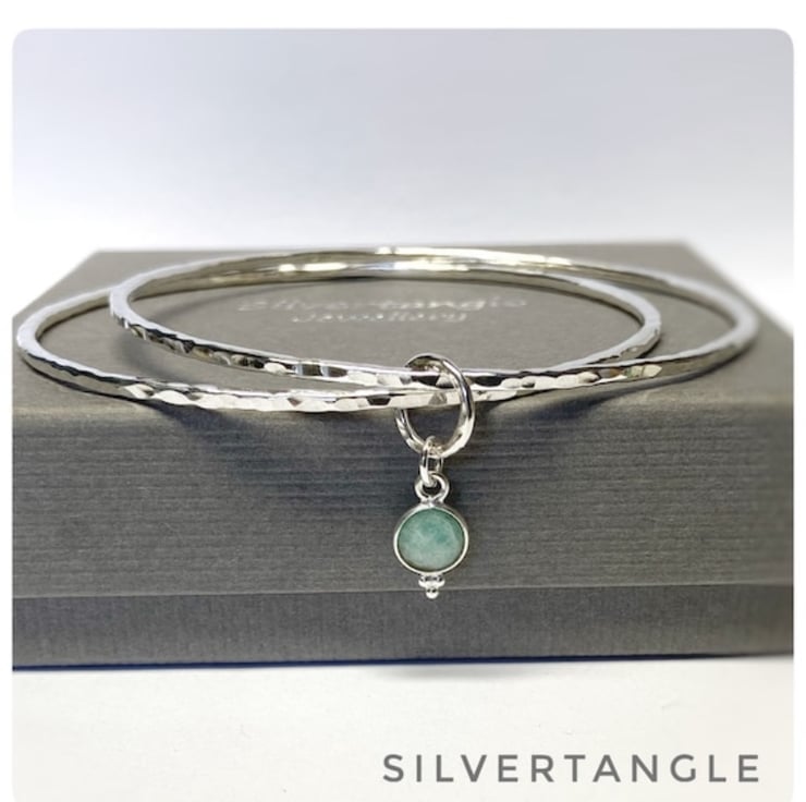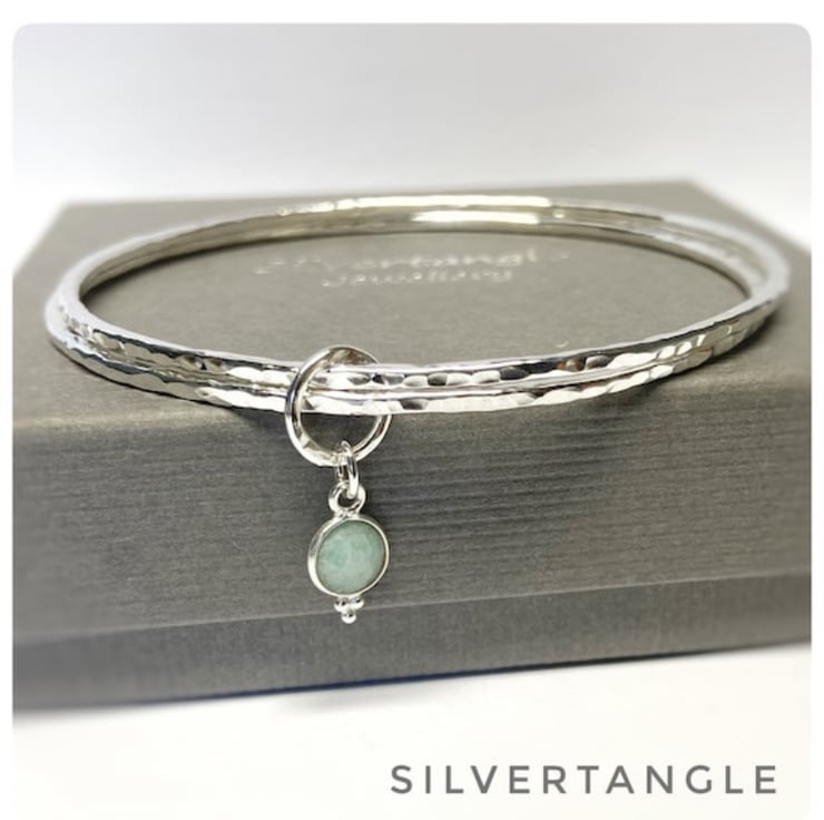 Both bangles are joined by a sterling silver soldered ring. This has been hammered too so is the same style as the bangles. Attached to this is a genuine Amazonite gemstone charm set in sterling silver.
