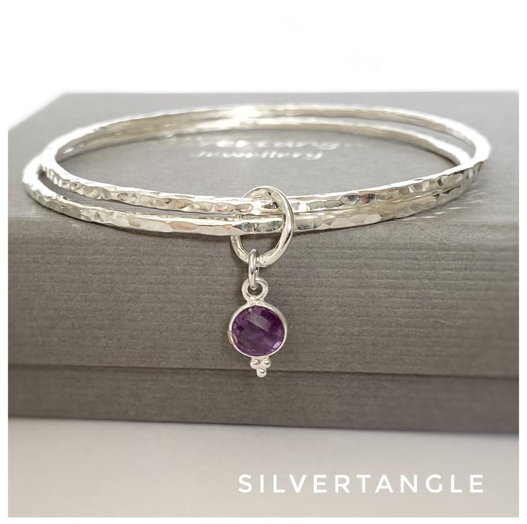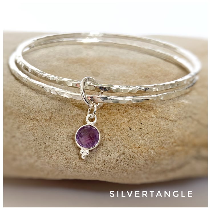 Both bangles are joined by a sterling silver soldered ring. This has been hammered too so is the same style as the bangles. Attached to this is a genuine faceted Amethyst gemstone charm set in sterling silver.