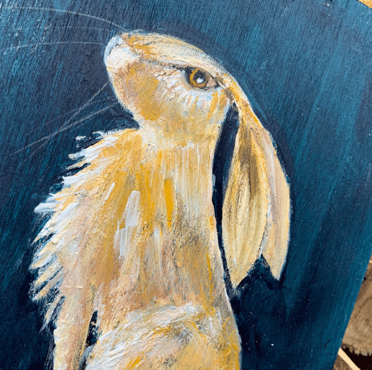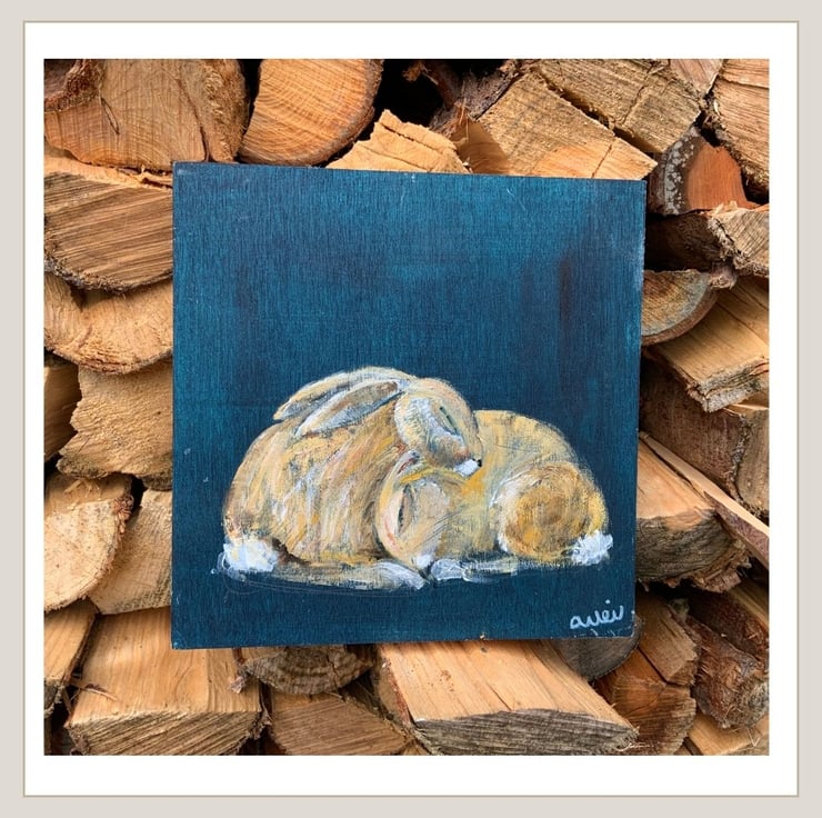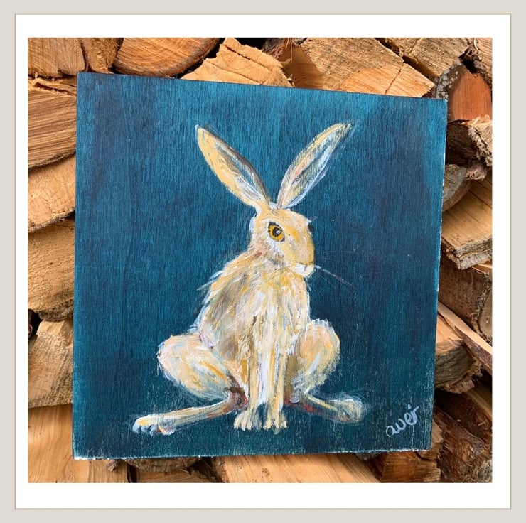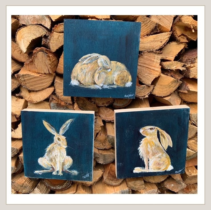 Painted across 3 square wood panels these 4 little hares have been painted using acrylic paints. They measure 15cm x 15cm x 2cm and all are ready to hang. They look fabulous as one image vertically or horizontally or can be split so will fit in to lots of different spaces.
