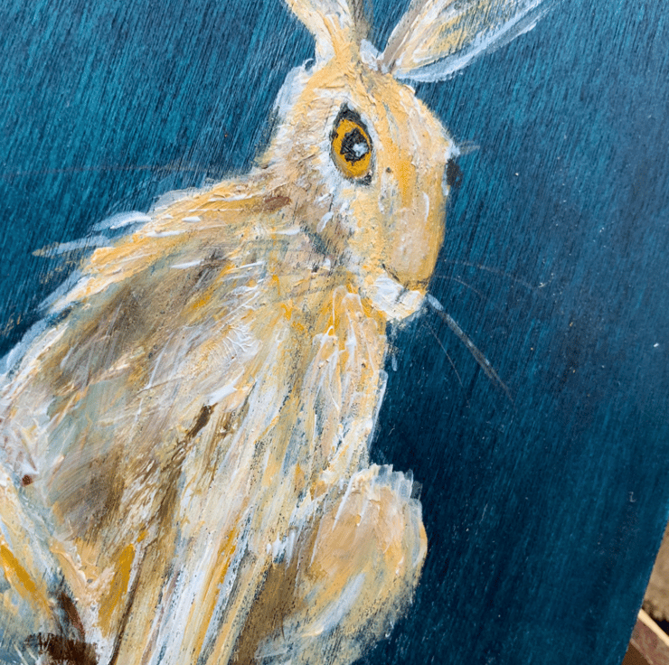 I had a little set off wooden panels and came up with the idea of the family of hares. These paintings were then used to create my hares in jumpers christmas cards.