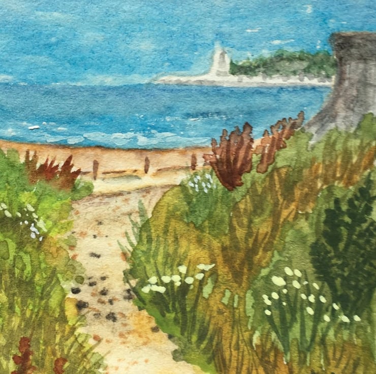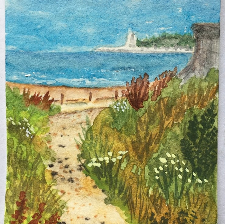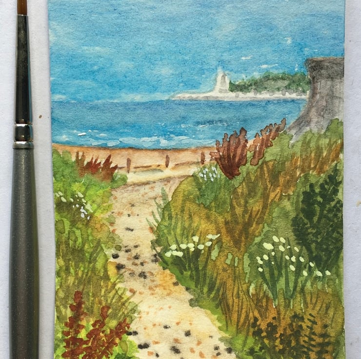 This hand painted aceo (aka art trading card) measures 3.5” x 2.5”, and uses Artist quality materials. It depicts a local beach scene in summer and there is a companion aceo available that shows the same scene in autumn. It will be carefully packaged and sent postage free to UK destinations.