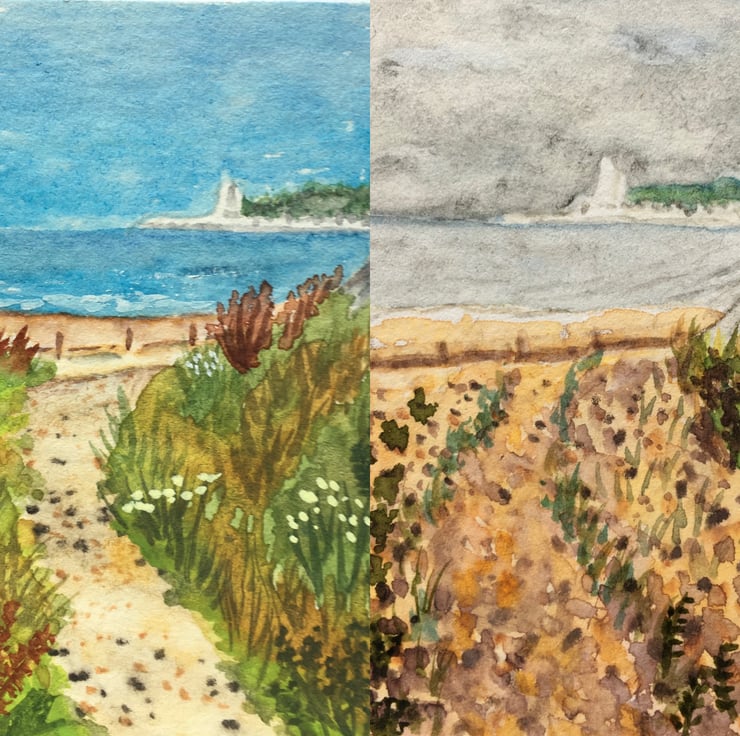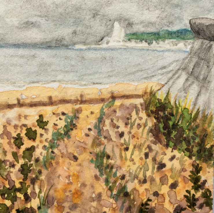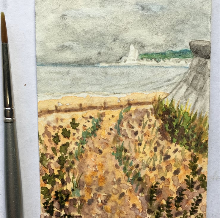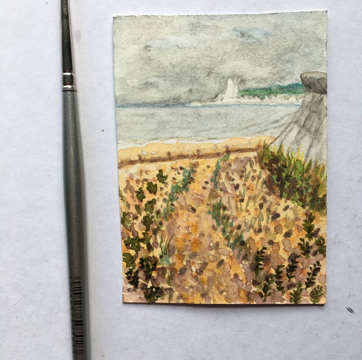 This aceo (art trading card) measures 3.5” x 2.5” and is hand painted using Artist quality materials. It shows a local beach in autumn and there is a companion aceo available showing the beach in summer. It will be carefully packaged and sent postage free to UK destinations.
