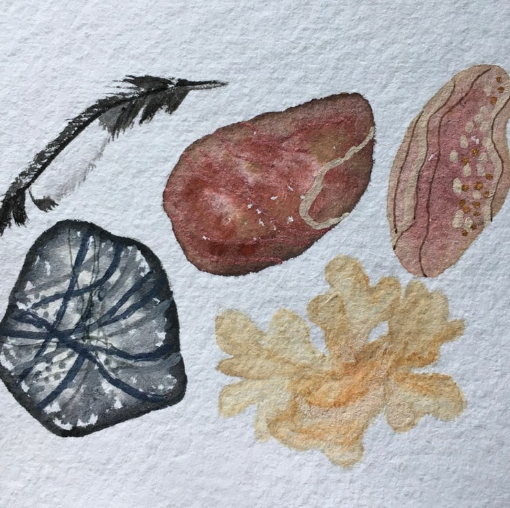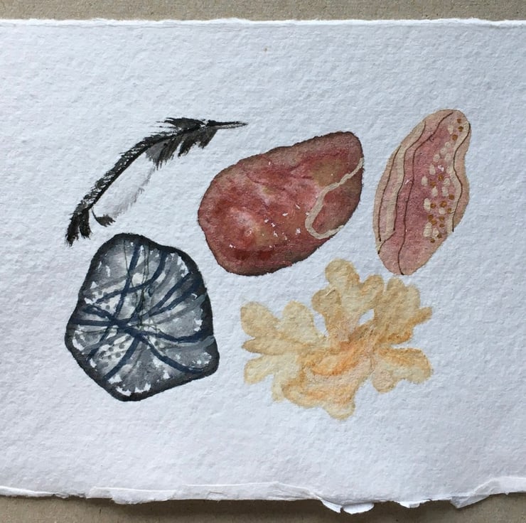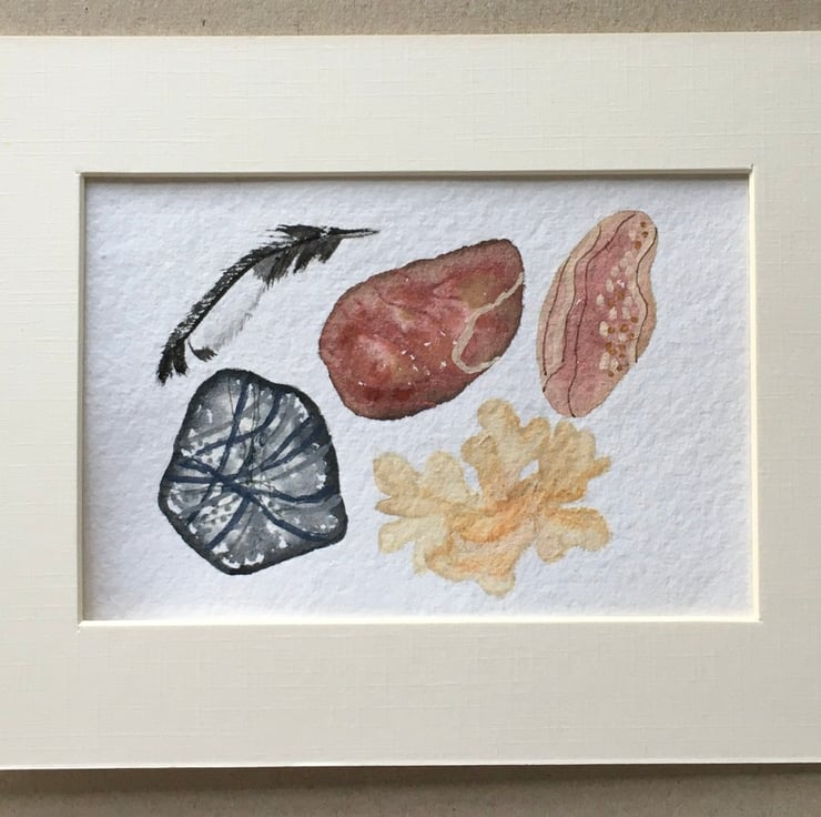 This original art is hand painted, using Artist quality materials on hand made watercolour paper, and measures approx 15 cm x 10 cm. It is inspired by finds on a local beach. It will be sent with a mount in a cello bag within a sturdy envelope, postage free to UK destinations.