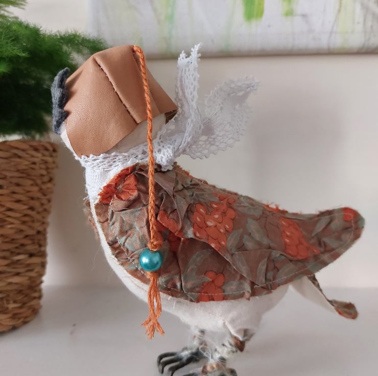 Spotting a kestrel hovering over the fields can make my day and this crumpled fabric remnant made the perfect piece for this little bird's plummage. I've given this one it's own falconry hood and pilot's scarf to celebrate the aerial acrobatics of this little species
