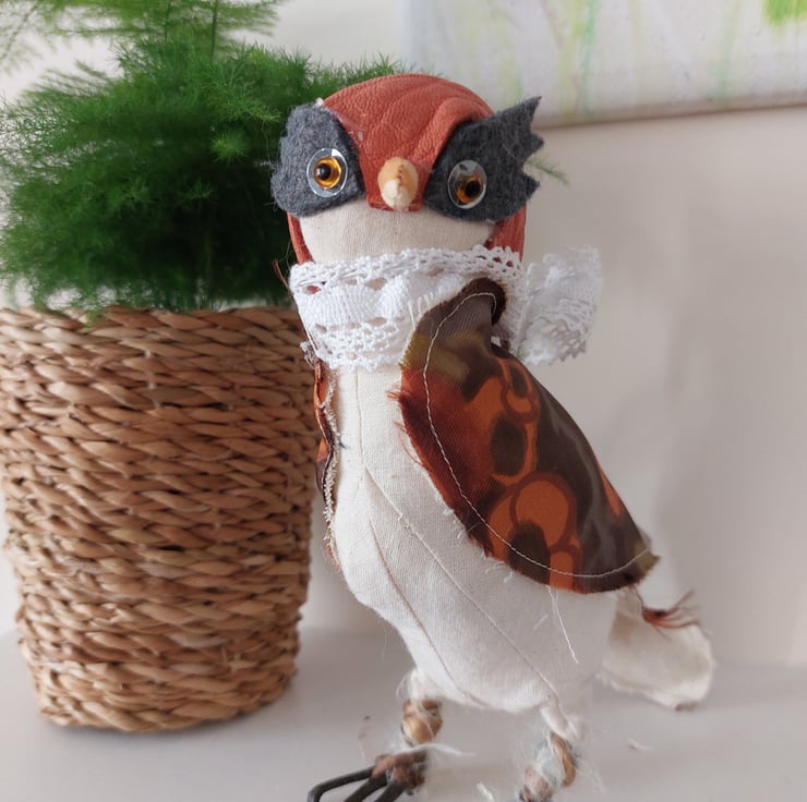With it's falconry hood pulled back and the wind in it's scarf this little aviator is ready for take off! Free standing soft sculpture.Approx 18cm height