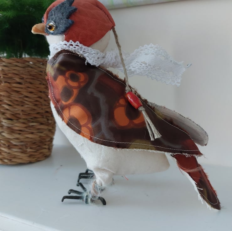 I wanted to give this little kestrel inspired bird a 'flying ace' character to celebrate it's aerobatics, hence the falconry hood and pilot's scarf!