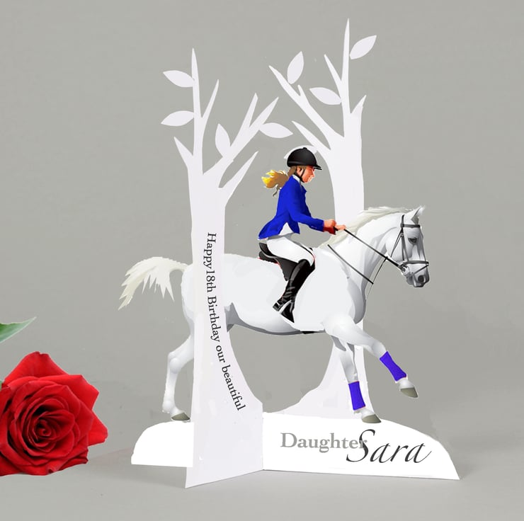 Beautifully handcrafted personalised show jumping/horse riding birthday card for a Daughter, Granddaughter, Niece, Goddaughter, Mum, Sister etc. For any age 10, 13 18. The card is cut into the shape of a girl riding through the trees. Message area on the back. All text can be personalised. to your requirements.