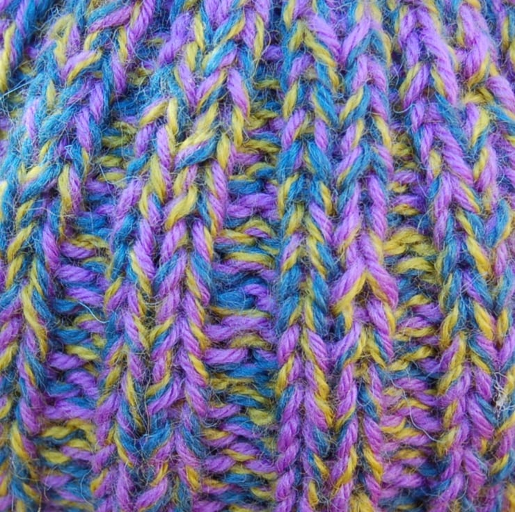A simple rib stitch shows off these gorgeous yarns. Colours are lavender, petrol blue and mustard green.