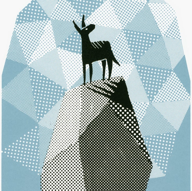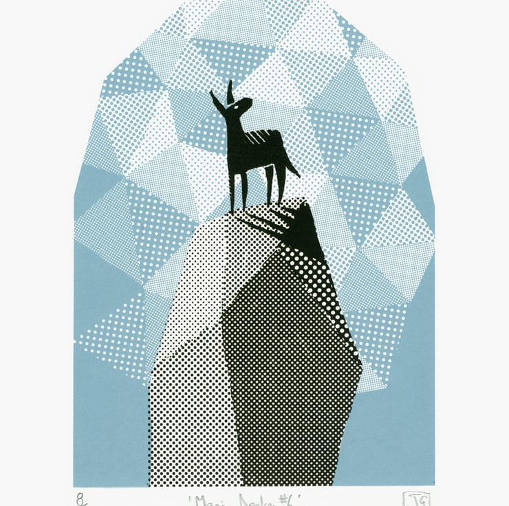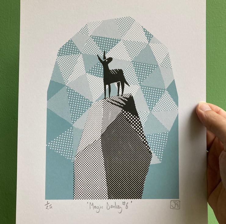 This is one of a continuing series of prints that I have made focussed on donkeys and their adventures in a strange and abstracted place. This print featured a magic donkey standing on a rock in a strange triangular environment.