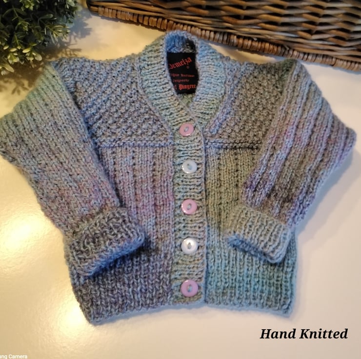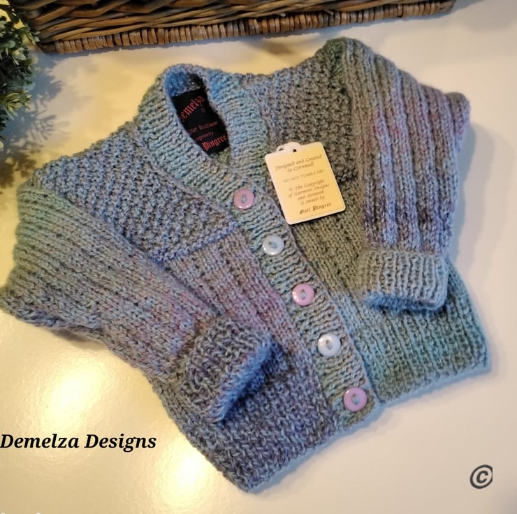 A lovely practical baby cardigan designed and lovingly hand crafted using quality branded British premium machine washable yarn which is so soft and cuddly like a teddy bear. Hand knitted baby knitwear is much warmer than mass produced cardigans due to the natural hand knitted stitch formation. A baby's body heat sits within the small stich caps making it very warm during wear. The buttons pic out the colours within the yarn. The Demelza Designs garment label is attached to the back neck edge with the care instructions woven within it for lasting reference.
