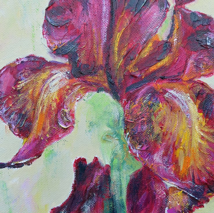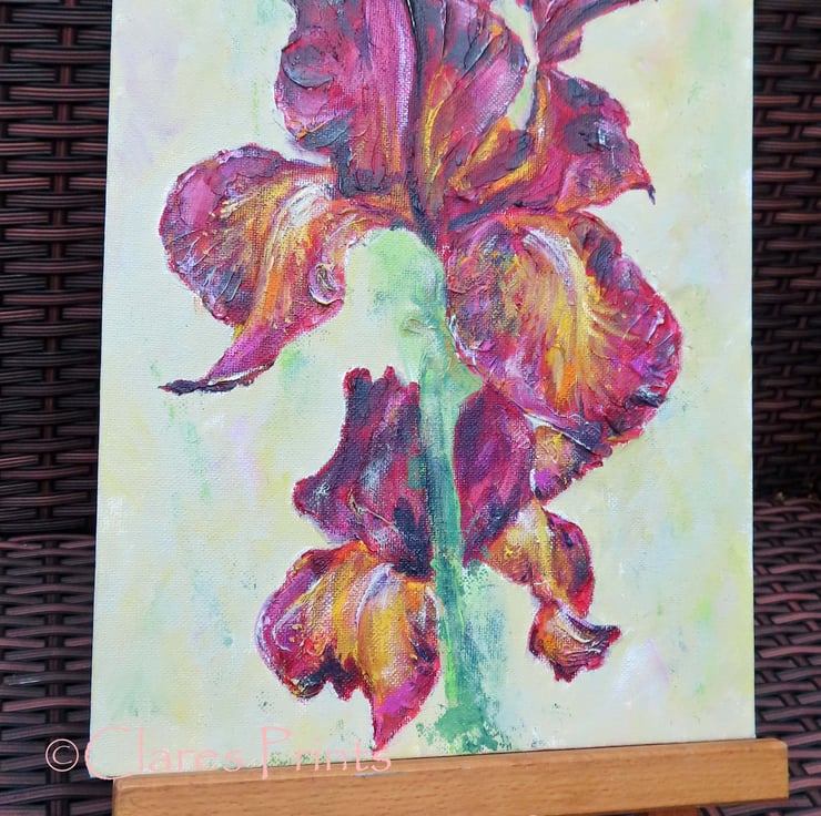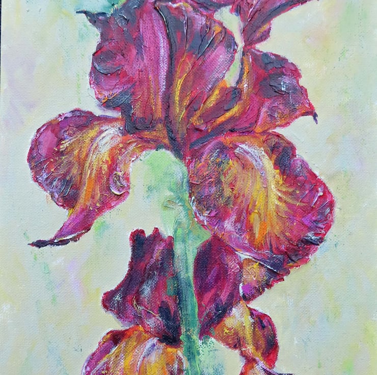 Original textured acrylic painting on a canvas board of a couple of bearded iris flowers growing in my garden this summer!